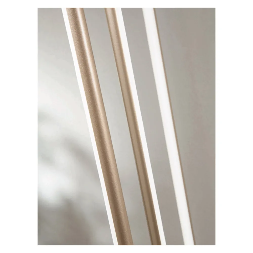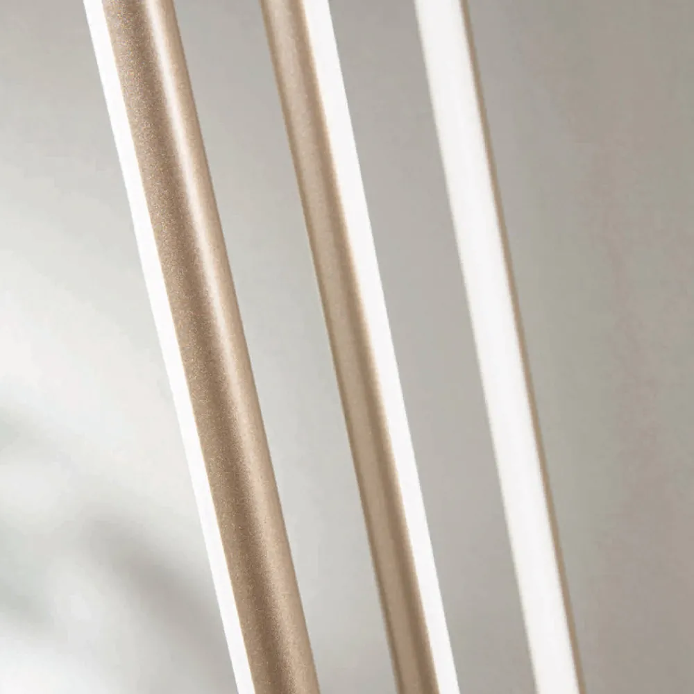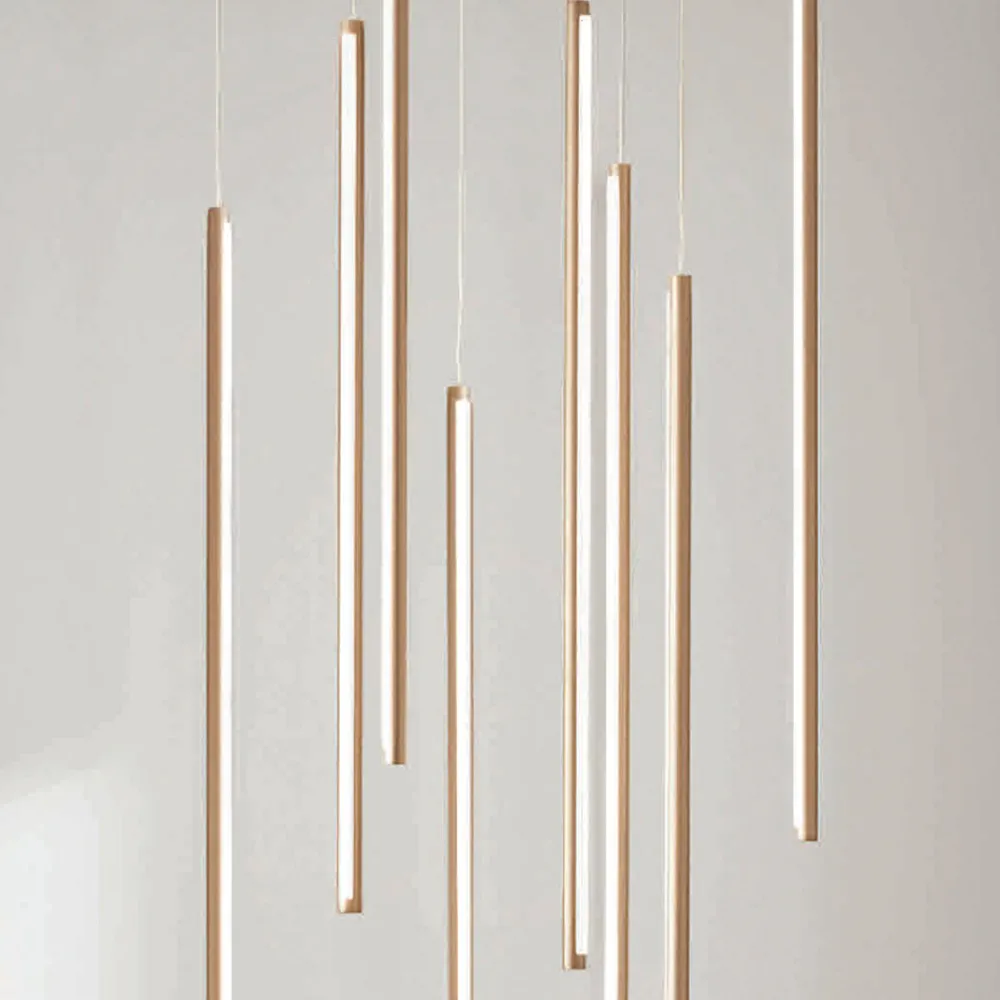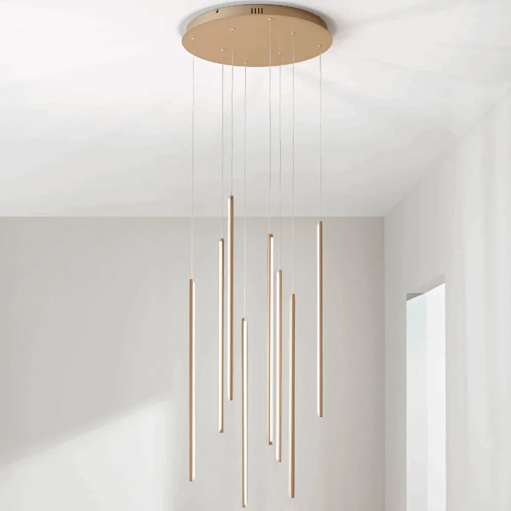 Komplett in Italien hergestellter Kronleuchter aus goldfarben lackiertem Metall mit dimmbarem LED- Licht und längenverstellbaren Kabeln .