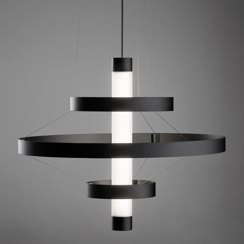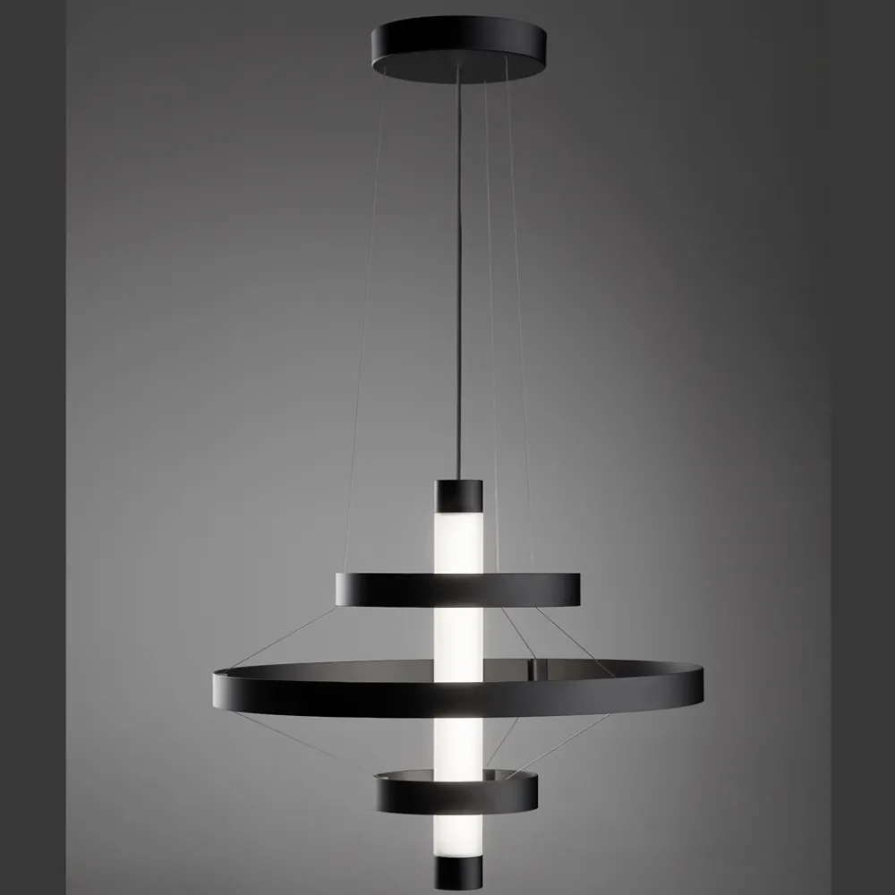 Kronleuchter für den Innenbereich mit einem zentralen Glaskörper, dem Dreh- und Angelpunkt von Licht und Energie, um den herum eine Reihe von Ringen unterschiedlicher Größe angeordnet ist, die aus Aluminium im Raum zu schweben scheinen.