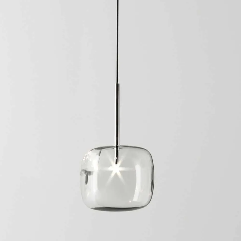 Design Pendelleuchte aus poliertem Metall mit abgerundetem Glaswürfel Made in Italy.
