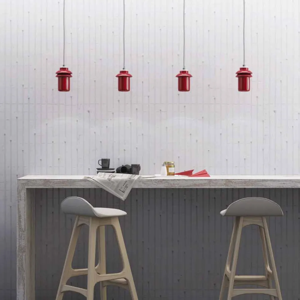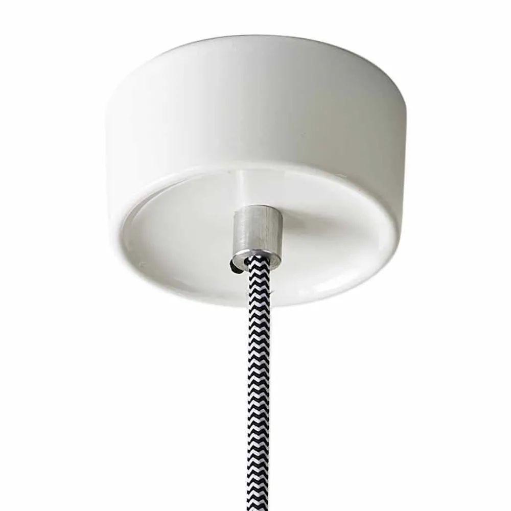 Asia ist eine fantastische Pendelleuchte aus roter Keramik mit einem schwarz-weißen Segeltuchkabel und einer Aluminiumkabelklemme.