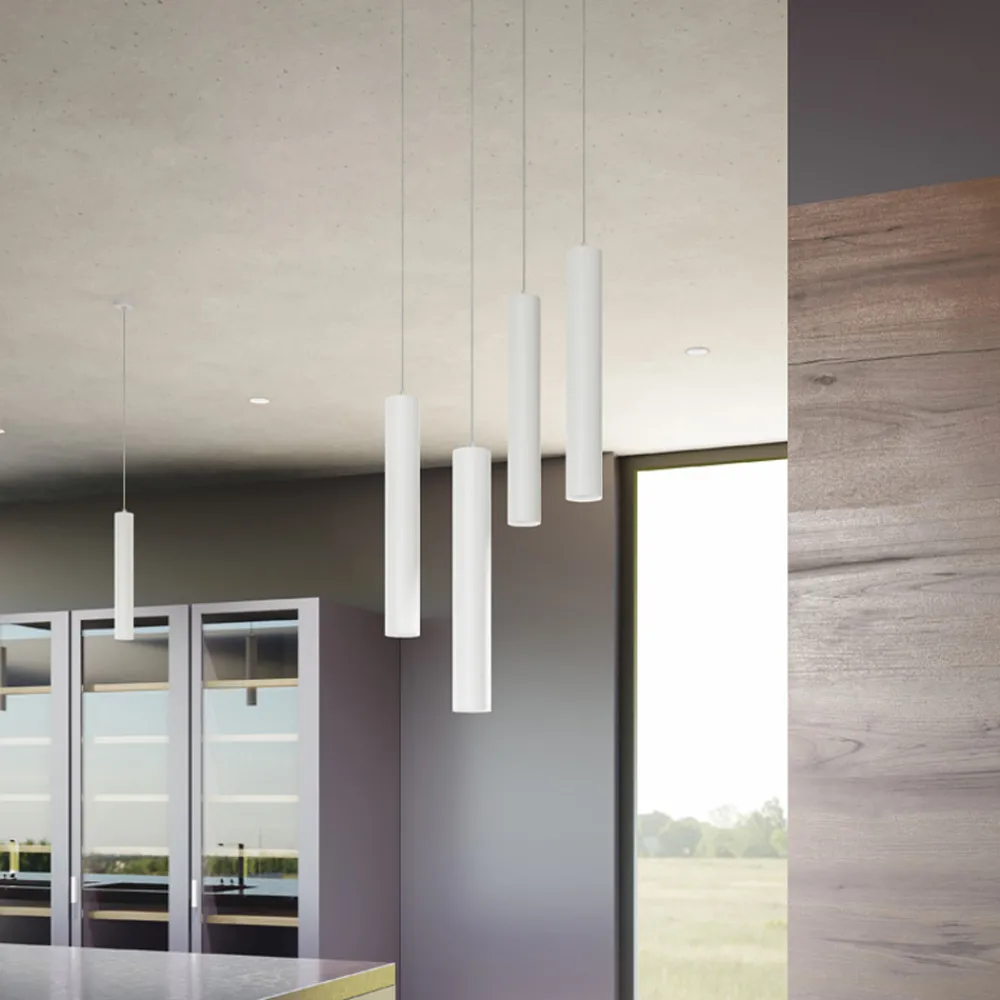 Pendelleuchte aus Aluminium mit eingelassenem Befestigungssockel. Eine Idee von zylindrischen Möbeln mit einem eleganten und minimalistischen Design , die sich jedem stilistischen Kontext perfekt anpassen und eine hochwertige Beleuchtung mit sich bringen . Seine Struktur macht es perfekt für wundervolle Kompositionen in den verschiedenen Bereichen des Hauses wie auf dem Esstisch, auf den Halbinseln, aber auch auf Bar- und Restauranttheken.