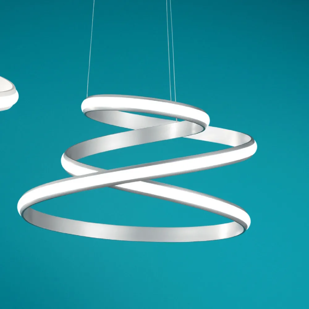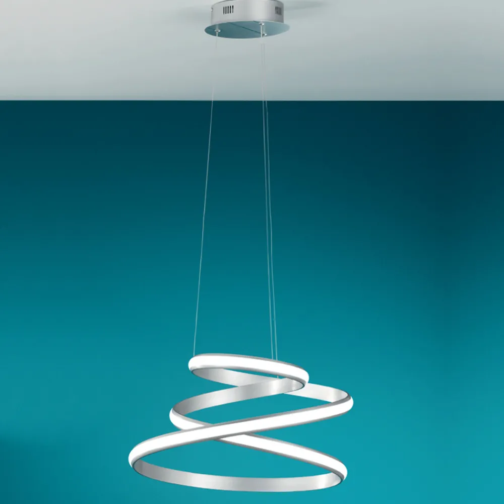 Pendelleuchte mit lackierter Metallstruktur komplett mit längenverstellbaren Kabeln und LED-Lichtquelle . Ein dynamisches und modernes Design, das in der Lage ist, das Gefühl eines sich drehenden Bandes nachzubilden und so den Wert und die Ästhetik des Produkts zu bereichern. Dieses Bewegungsgefühl wird zu seiner Stärke und ermöglicht es ihm, in Wohn- oder Objektumgebungen mit einem zeitgenössischen und avantgardistischen Stil den Mittelpunkt der Aufmerksamkeit zu erobern. Die moderne LED-Technologie sorgt zudem für eine hochwertige Beleuchtung, die die Leuchte vervollständigt und sie zu einer optimalen Ergänzung für alle macht, die Funktionalität und Design in einem einzigen Produkt suchen.