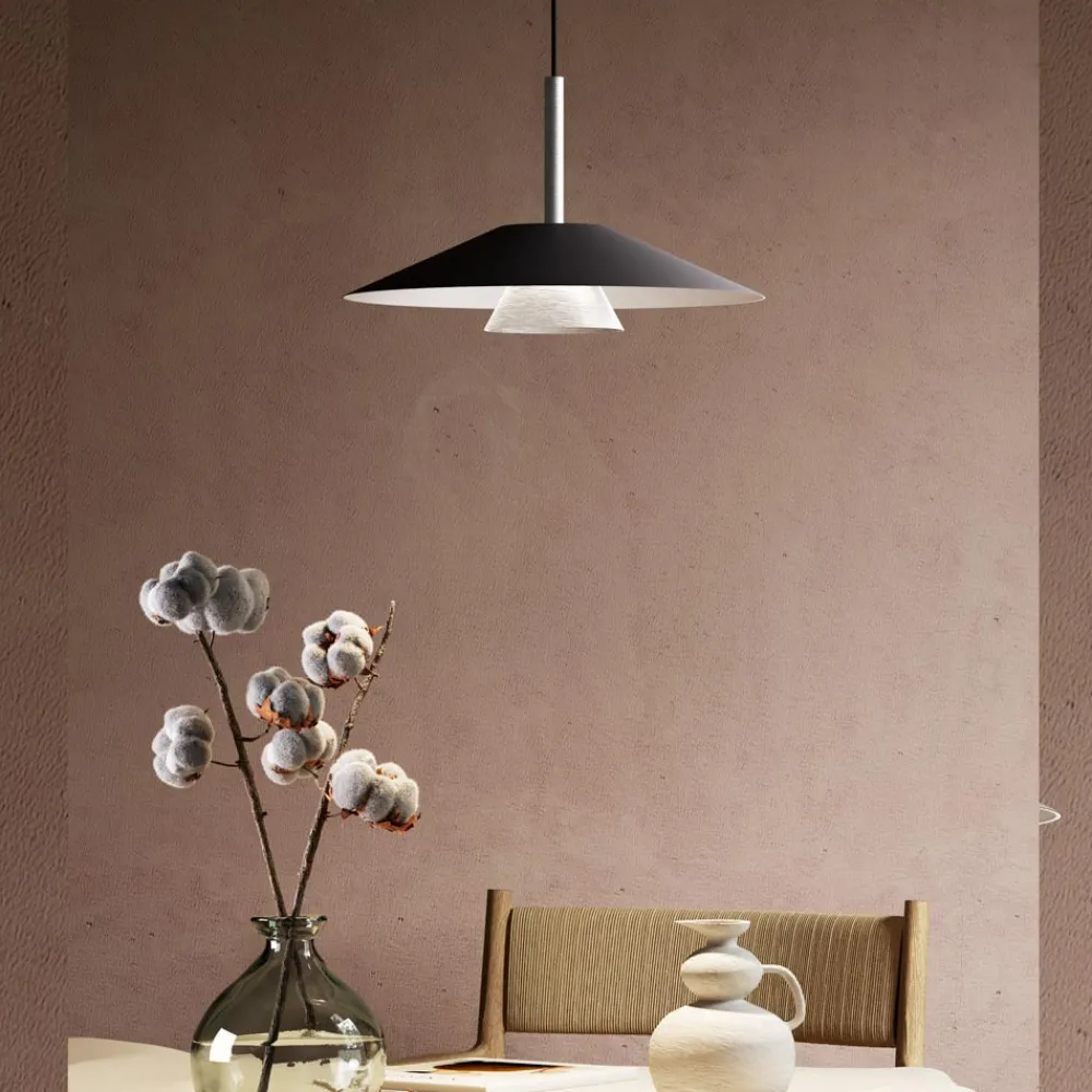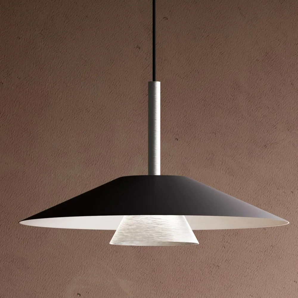 Diese Lampe ist eine perfekte Verschmelzung von zeitgenössischem Design und industrieller Eleganz und wurde für diejenigen entwickelt, die raffinierte Details und eine kühne Ästhetik lieben. Die geometrische Struktur mit einem konischen Diffusor und einer großen reflektierenden Scheibe erzeugt ein faszinierendes Spiel von Volumen und Kontrasten und sorgt für ein gerichtetes und einhüllendes Licht.