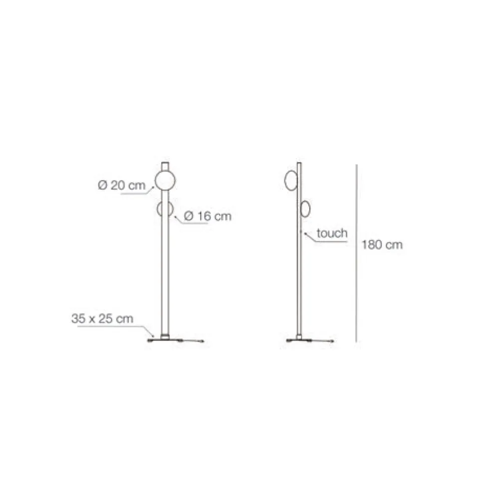 Diese Stehleuchte ist eine perfekte Balance zwischen skulpturalem Design und funktionaler Eleganz und ideal, um jeden Raum mit einem modernen und raffinierten Stil aufzuwerten. Die schlanke, geometrische vertikale Struktur beherbergt zwei kugelförmige Diffusoren aus Opalglas , die in perfekter Balance zu schweben scheinen und ein weiches, einhüllendes Licht abgeben.