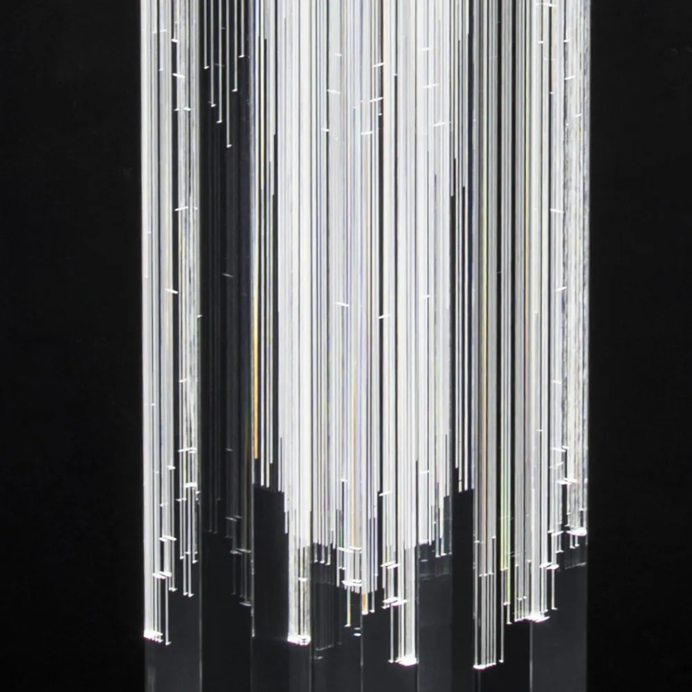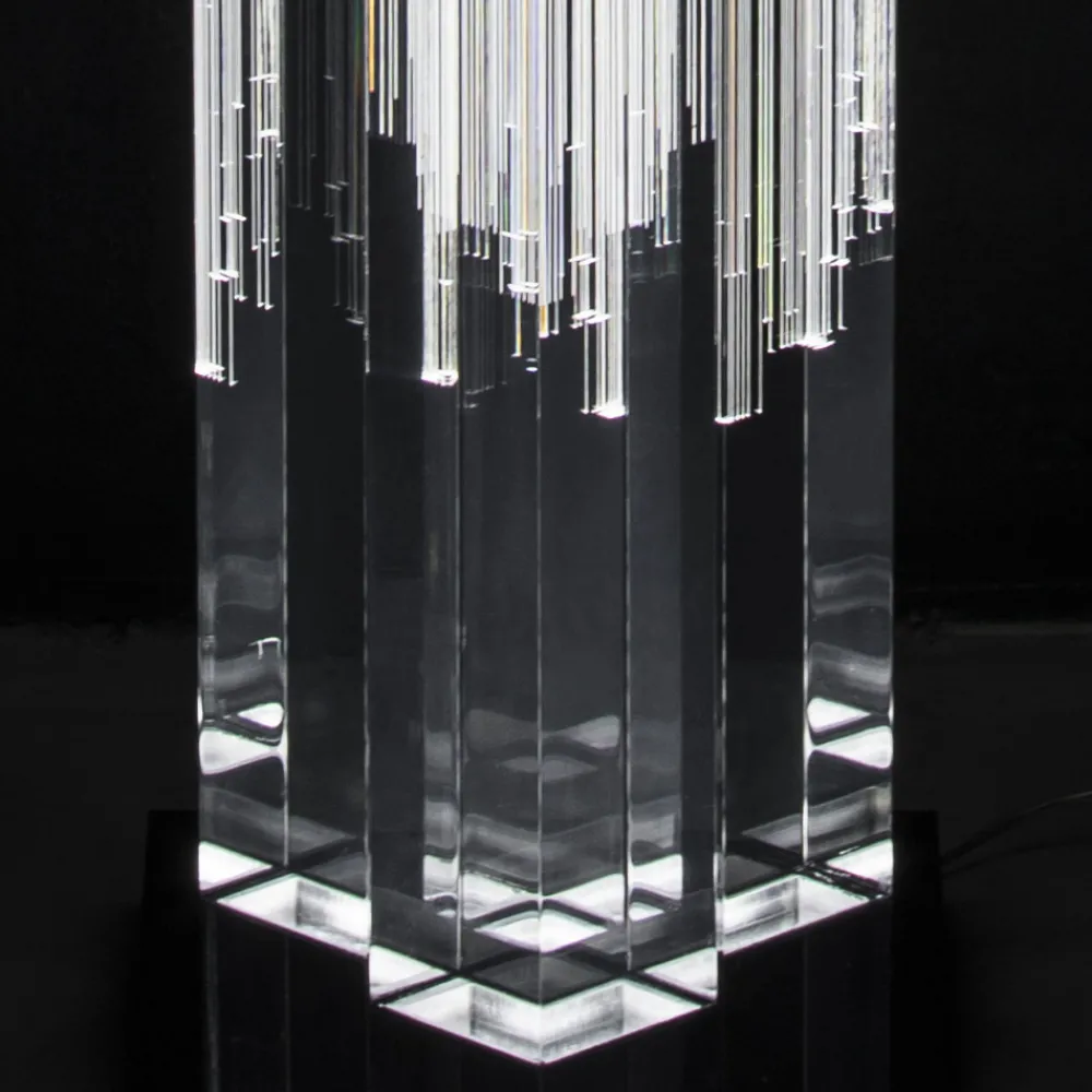 Diese Stehlampe besteht aus einzigartigen Blöcken aus Acrylkristall, die mit Lasertechnologie geschliffen und graviert wurden , und einem Sockel mit dem LED-Leuchtkörper.