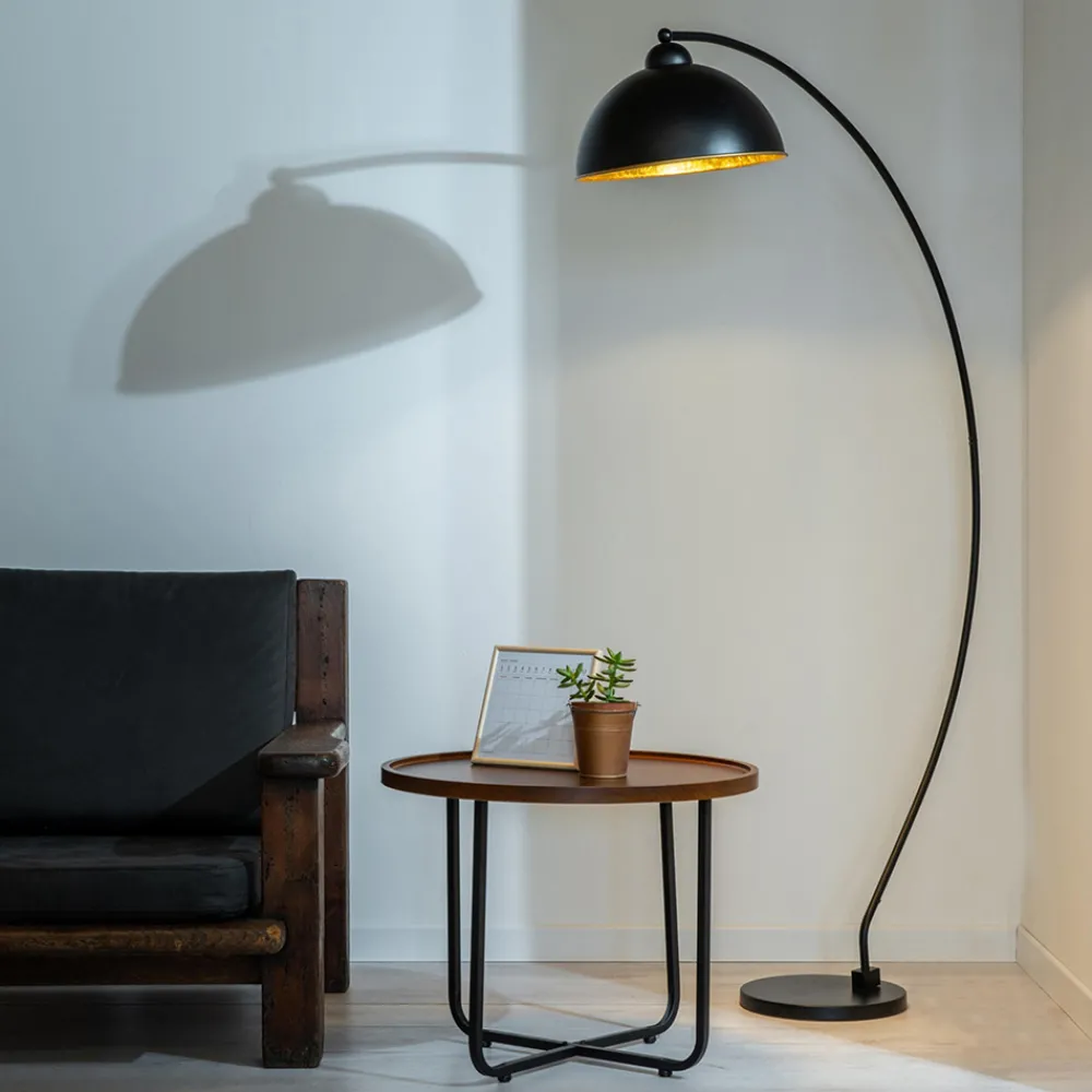 Stehlampe aus schwarz lackiertem Metall mit goldenen Details.