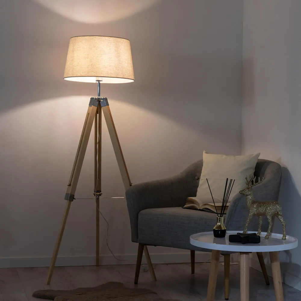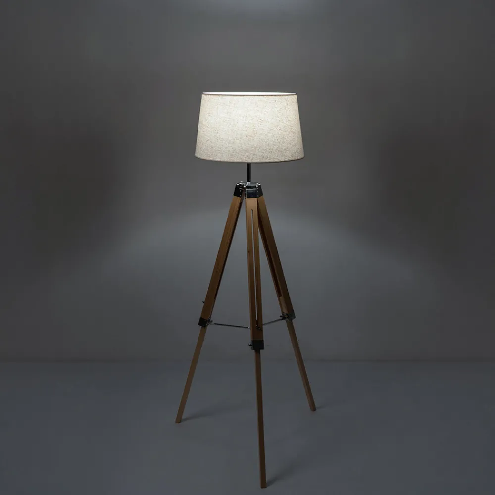 Moderne 3-Fuß-Stehlampe aus Holz mit Lampenschirm aus grauem Segeltuch.