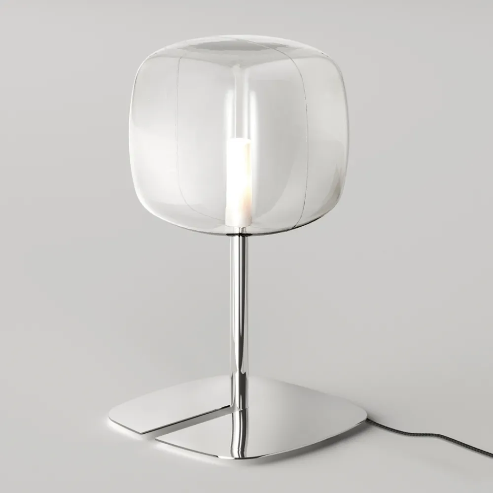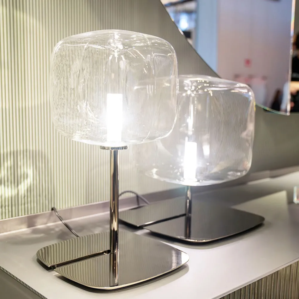 Tischlampe komplett in Italien hergestellt mit kubischem Lampenschirm aus transparentem mundgeblasenem Pyrexglas und glänzender Metallstruktur. Eine äußerst elegante und wirkungsvolle Beleuchtungsidee, die dazu beiträgt, eine raffinierte und moderne Atmosphäre in jeder Wohnumgebung zu schaffen. Sein Design zeichnet sich durch eine große formale Sauberkeit aus , eine Eigenschaft, die es ermöglicht, in jedem Bereich des Hauses platziert zu werden, vom Wohnbereich über den Schlafbereich bis zum Arbeitszimmer. Die beiden vorgeschlagenen Größen ermöglichen es zudem, die unterschiedlichen Höhen und Breiten für Mehrfachkonfigurationen mit starker Bühnenpräsenz zu kombinieren, aber auch für den einmaligen Gebrauch als kleines Gestaltungsdetail im Raum.