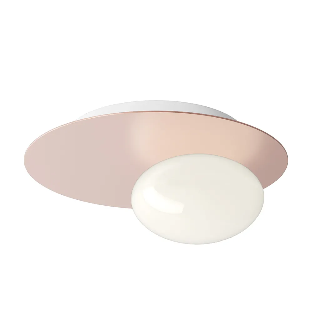 Wandleuchte für den Innenbereich mit einer Struktur aus recycelbarem Aluminium, einer Deckenrosette aus Metall und einer Lampe aus milchig weißem geblasenem Glas.