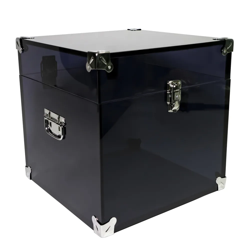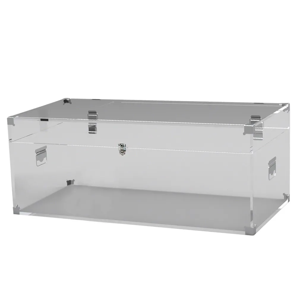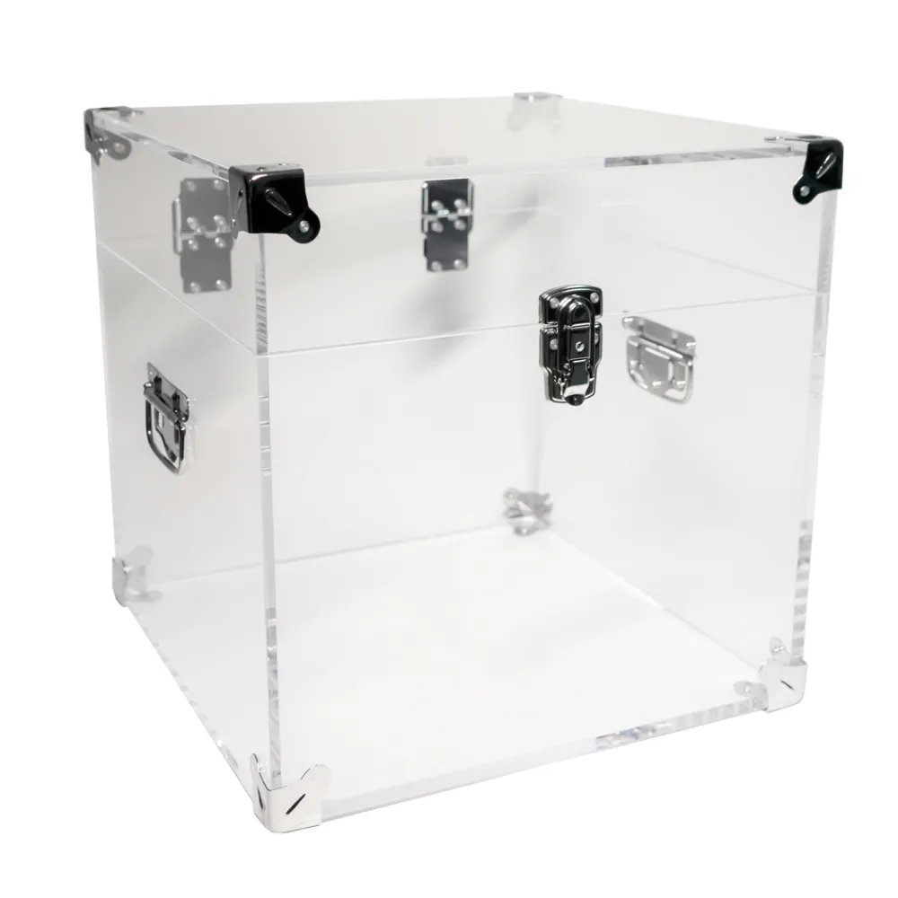 Dieser Koffer besteht vollständig aus gefaltetem Acrylglas, erhältlich in 2 Varianten mit einer Dicke von 10 mm, vollständig UV-verklebt mit edlen verchromten Stahloberflächen.