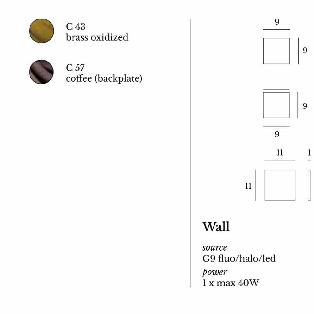 Wandleuchte mit Struktur aus oxidiertem Messing und Unterbau aus pulverbeschichtetem Stahl. Erhältlich in zwei Größen in der runden oder quadratischen Form. Diffusor aus gehärtetem Glas für direkte und indirekte Lichtemission.