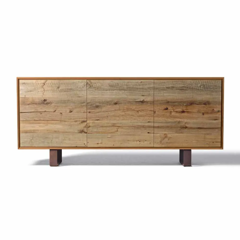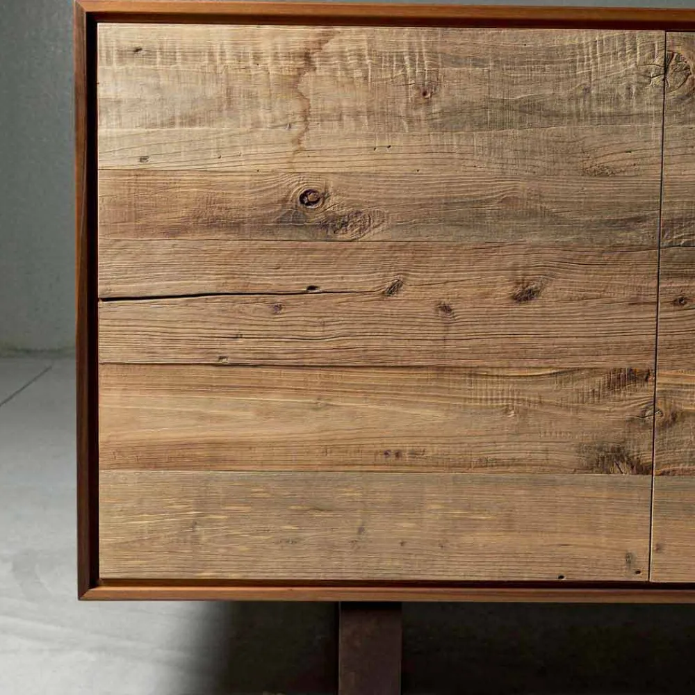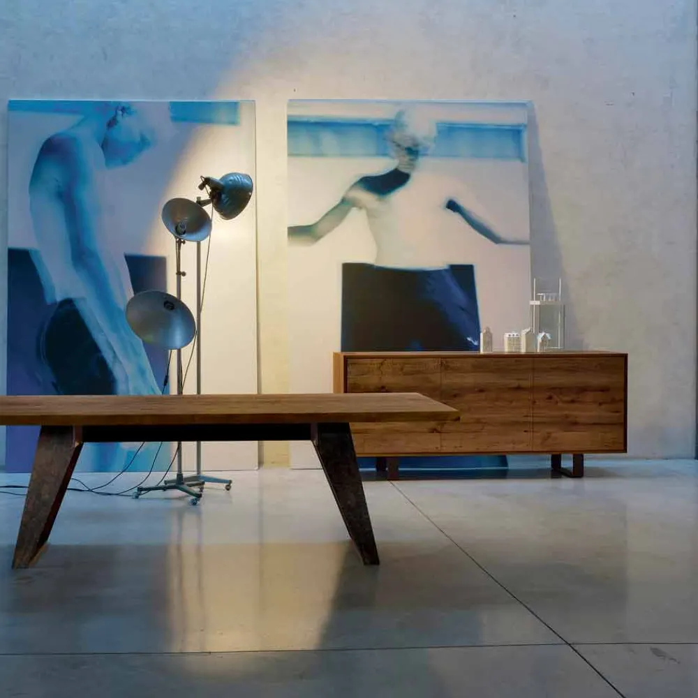 Das formale Gleichgewicht des Sideboards bietet sich für mehrere Materialinterpretationen an. Bei dieser Lösung steht die Reinigung der Außenstruktur im Gegensatz zur Ontano-Tür mit „rauem“ Finish, dem unbestrittenen Protagonisten der Szene.