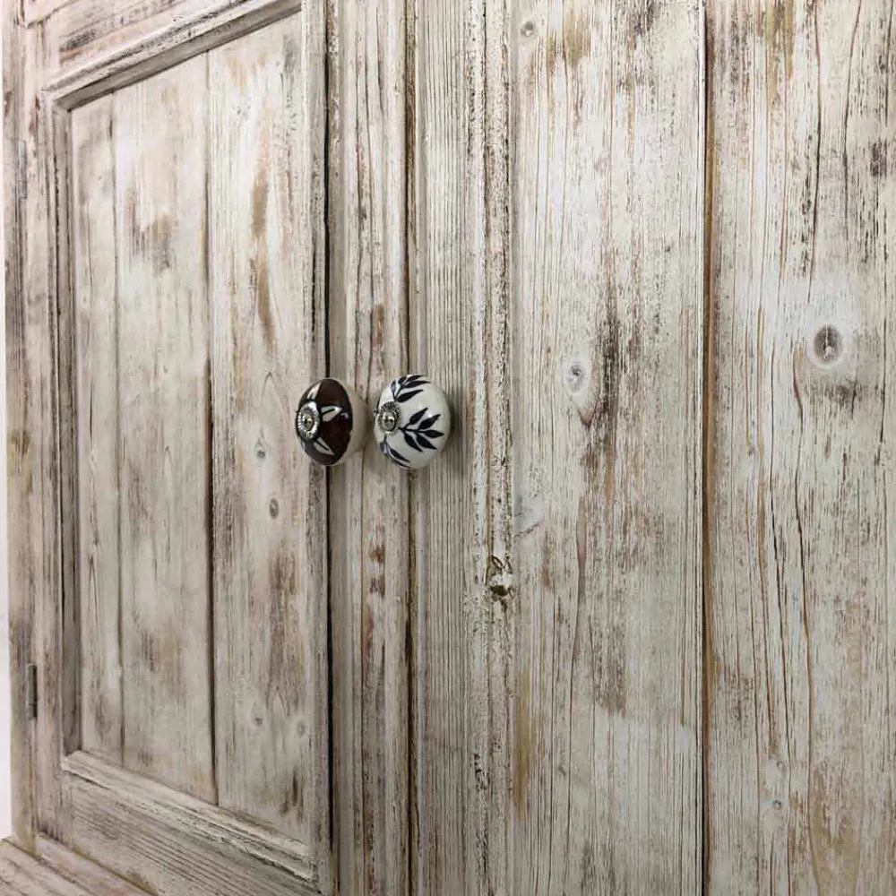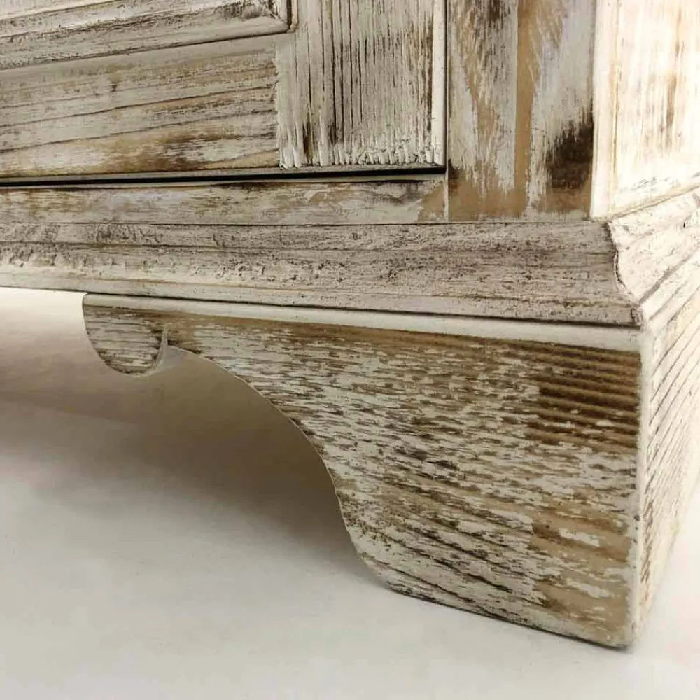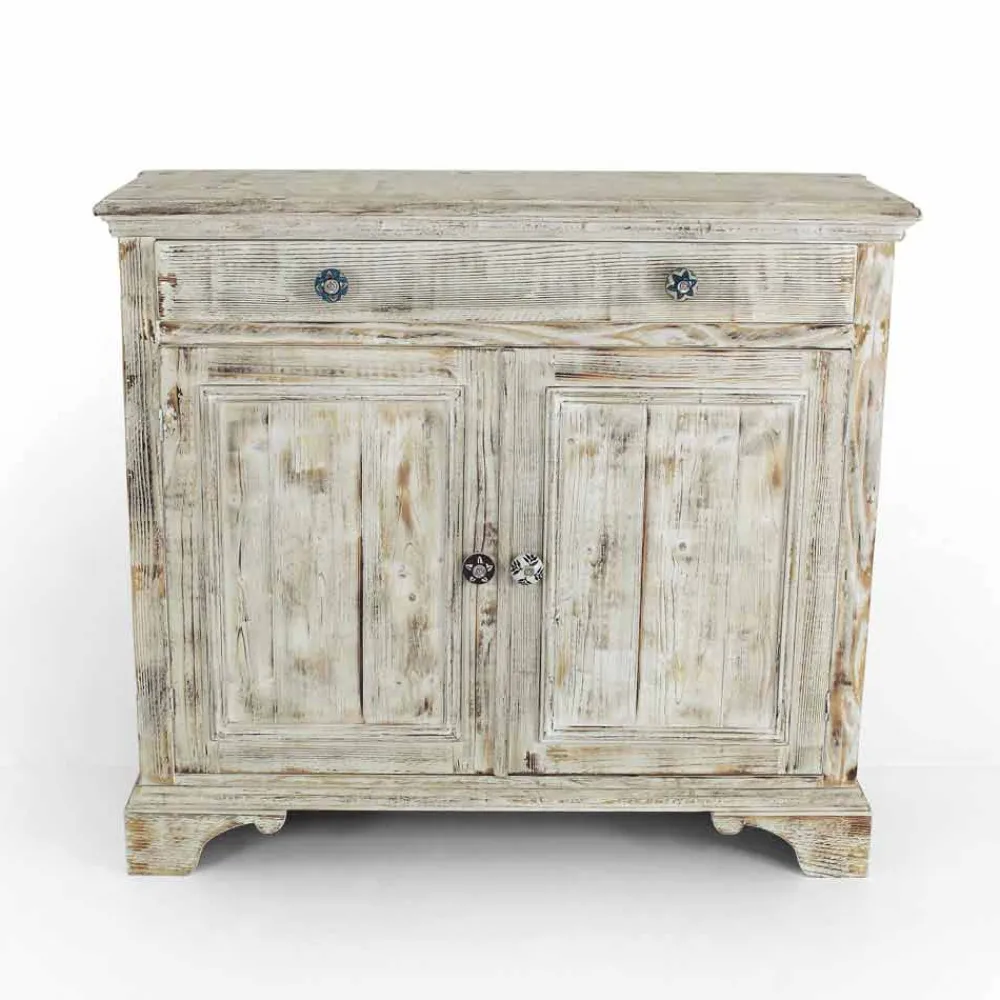 Sideboard aus massivem Tannenholz, vollständig handgefertigt in Italien und gekennzeichnet durch das wundervolle flammengebrannte, enthäutete Finish, das die besondere Maserung des Holzes hervorhebt, die das Produkt einzigartig macht. Das Sideboard wird dann mit einer gealterten weißen Farbe versehen und mit der transparenten Oberfläche versehen, die es wasserabweisend macht und die Farben so fixiert, dass sie im Laufe der Zeit unveränderlich sind. Die Struktur umfasst 2 Türen mit internem Regal und 1 Schublade mit Pappelsperrholzboden, die mit speziellen handbemalten Keramikknöpfen versehen sind, die Ihnen perfekt organisierte Räume ermöglichen.