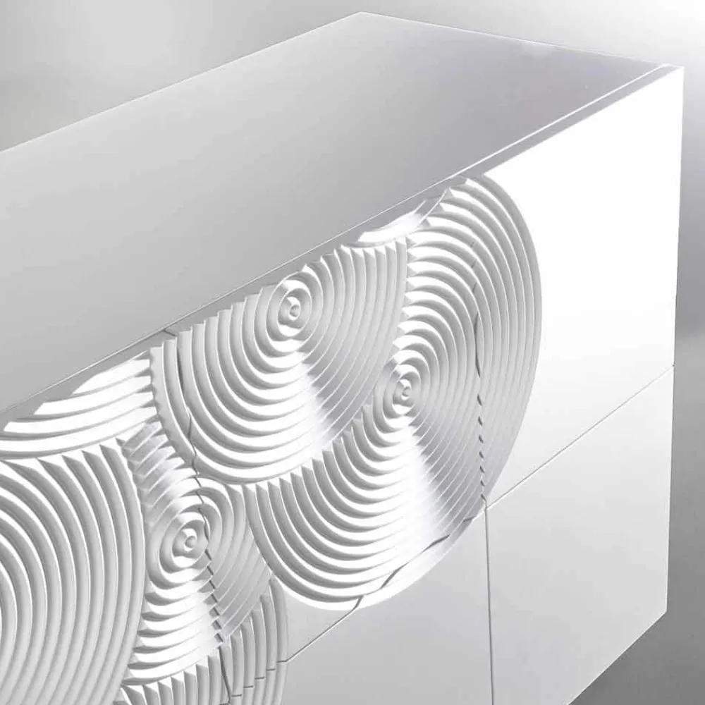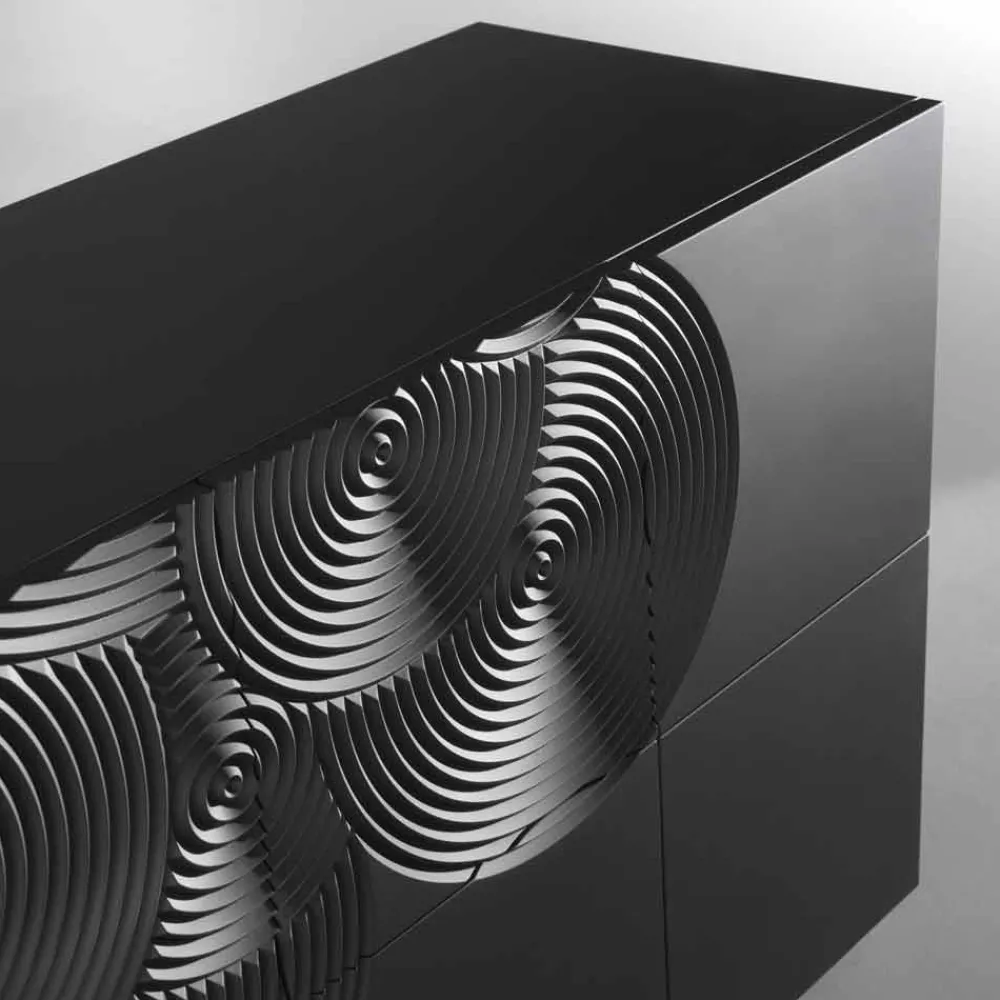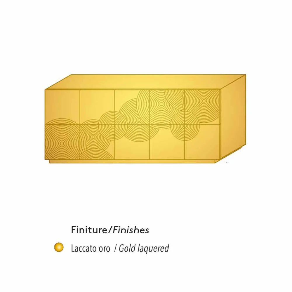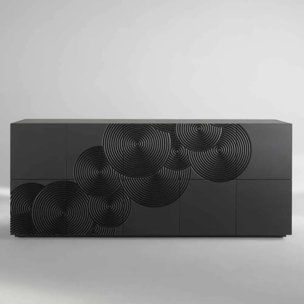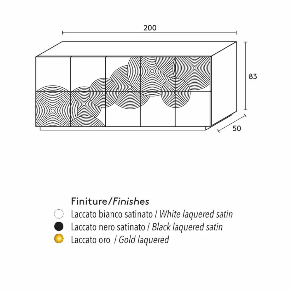 Madia ist mit Ihren 10 Schranktüren ein echtes High Light in Sachen Stauraum, im Innenraum befinden sich 6 Aufbewahrungsregale die für Ordnung sorgen. Das italienische Design richtet sich nach einen schlichten und einfachen Aufbau, klare Linien und einer skulpturartigen Wirkung. Die Oberfläche des Sideboard besteht aus lackierten MDF und wurde mit kreisenden Musterringen optisch aufgewertet, die eine harmonische Atmosphäre verleihen.