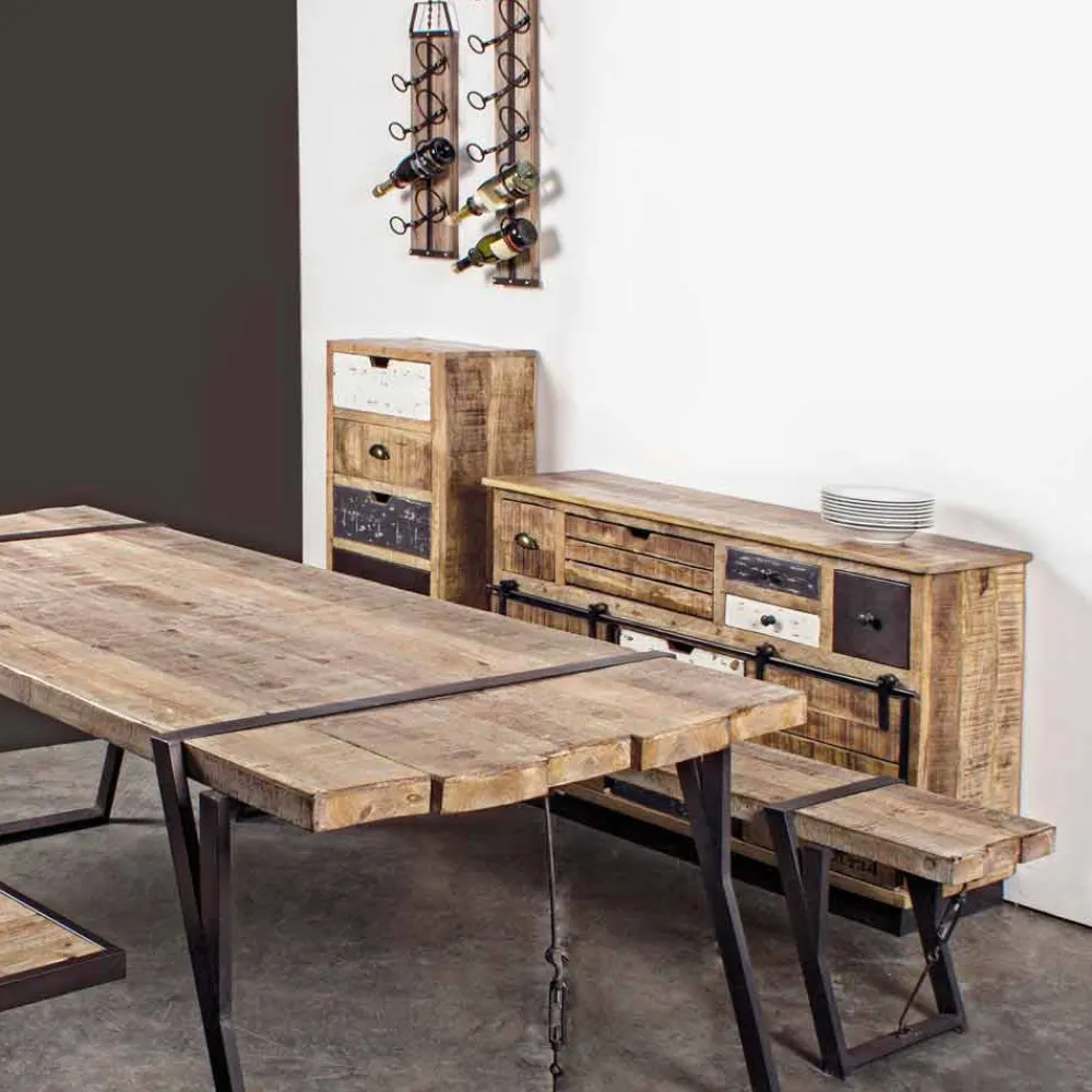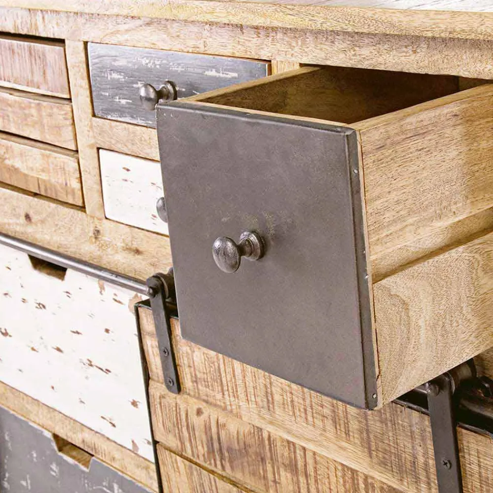 Sideboard im Industriestil mit Struktur aus Mangoholz und Stahl.