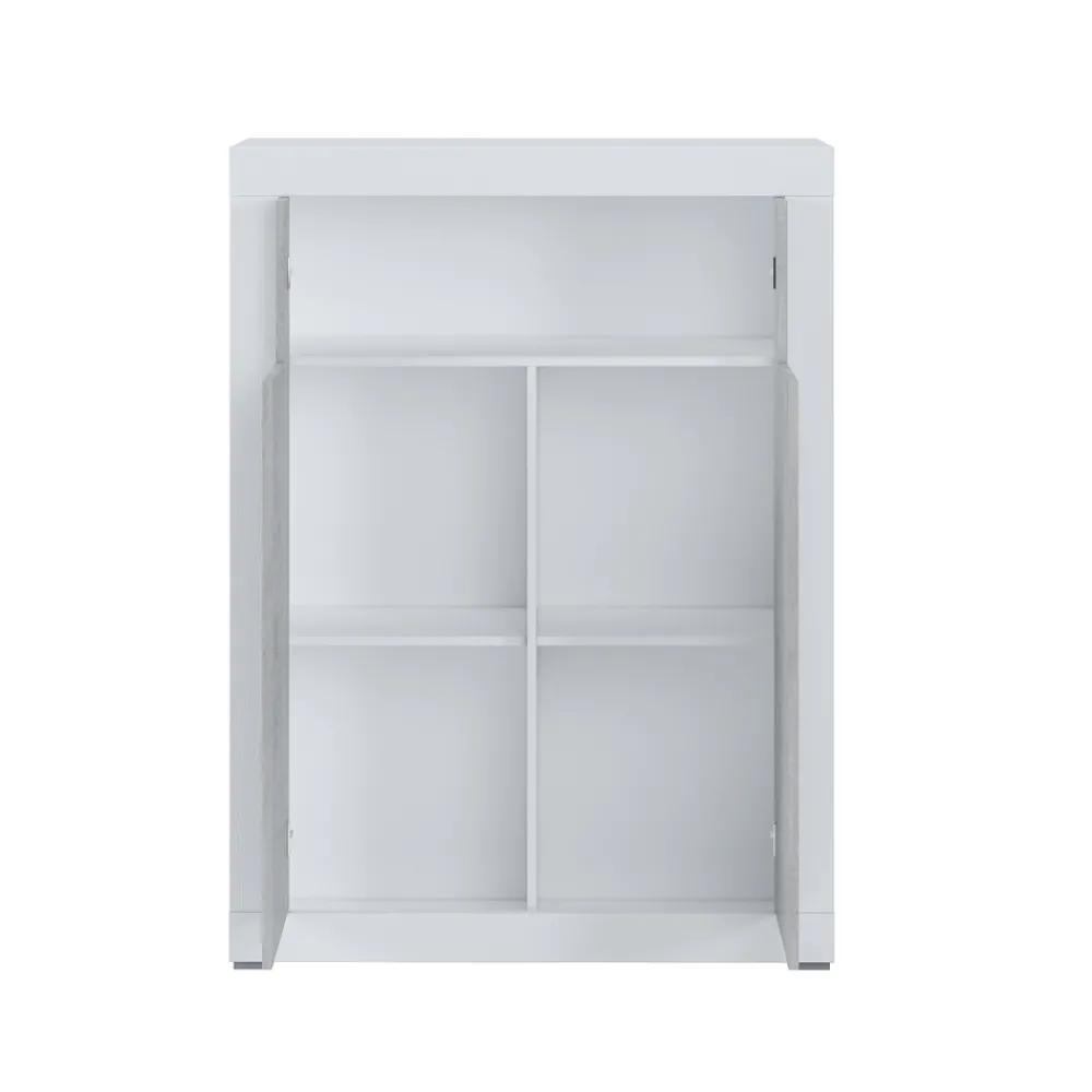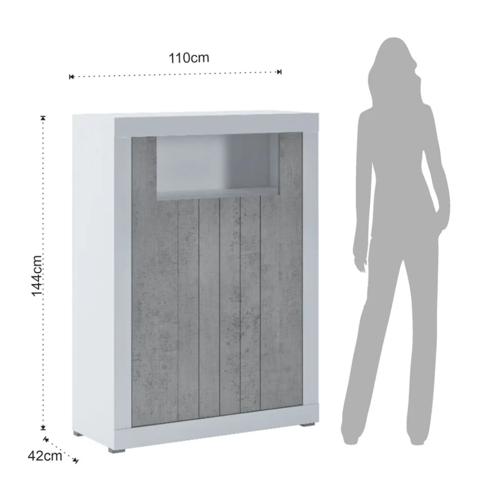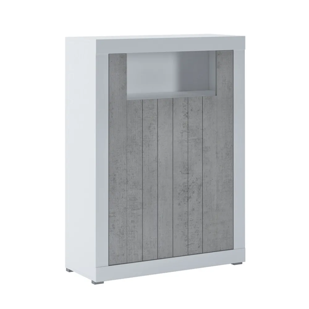 Wohnzimmermöbel aus ökologischen Holzspanplatten , Struktur mit offenporigem Melaminharz in Lärchenoptik weiß , Fronten mit Melaminharzbeschichtung in Zementoptik , mit 2 Türen.