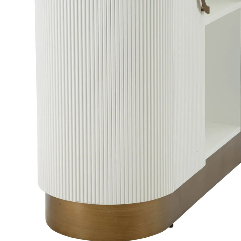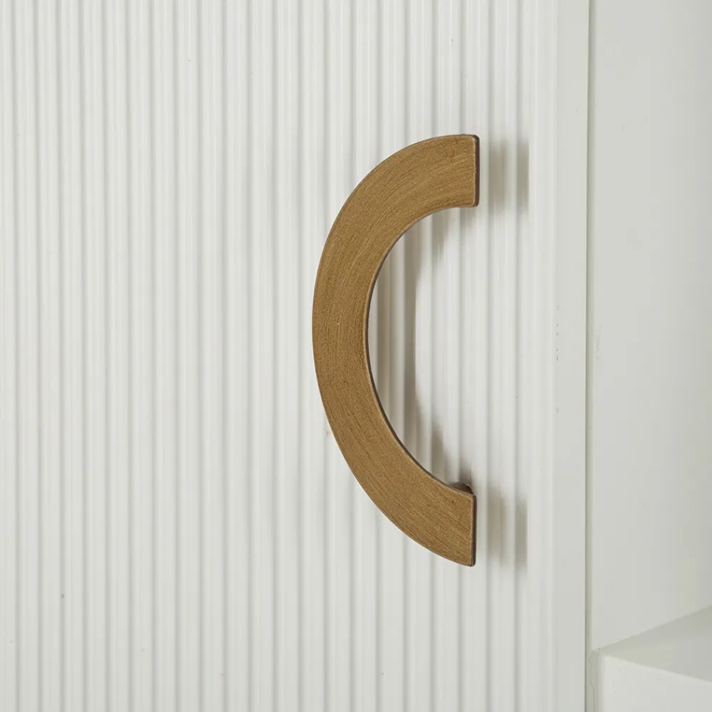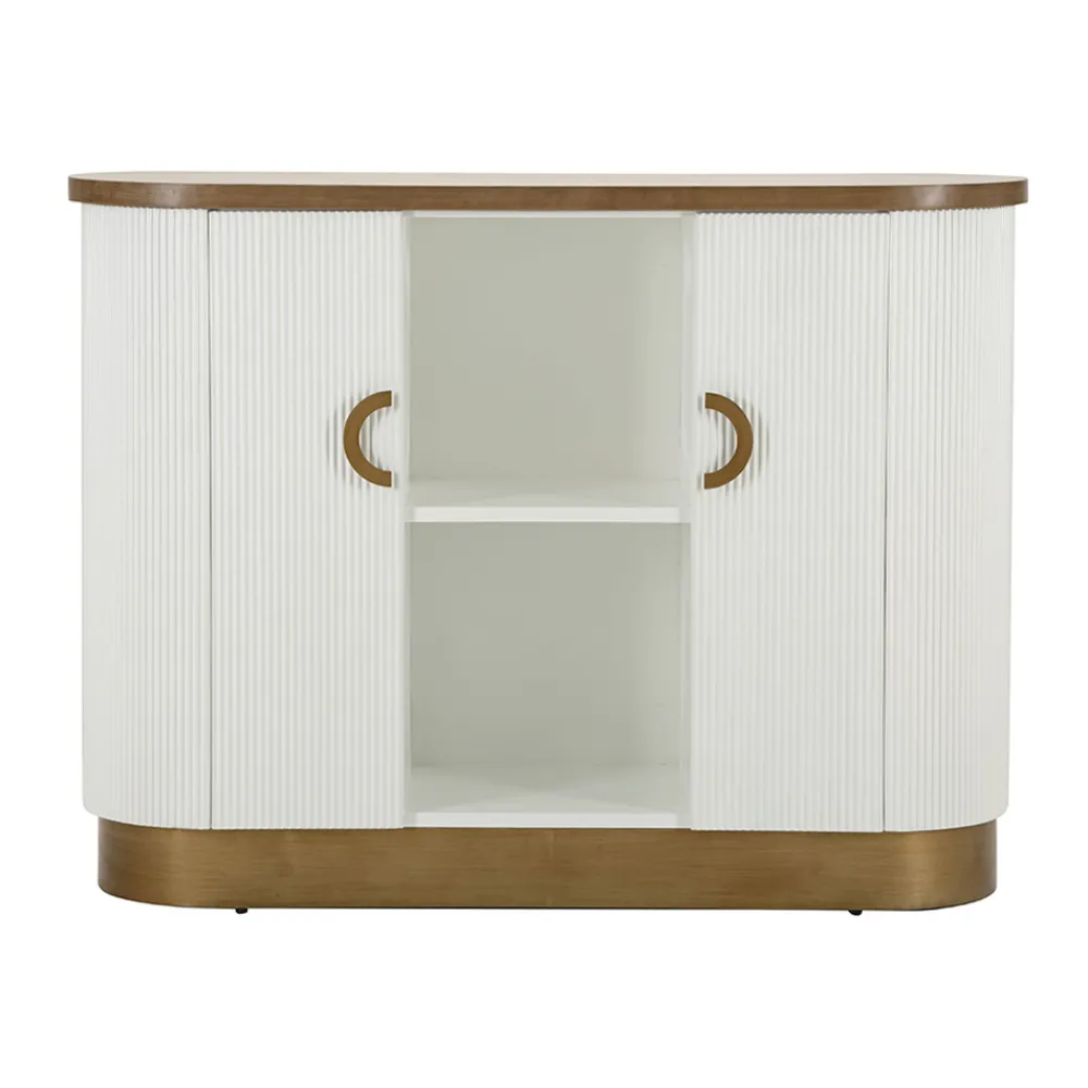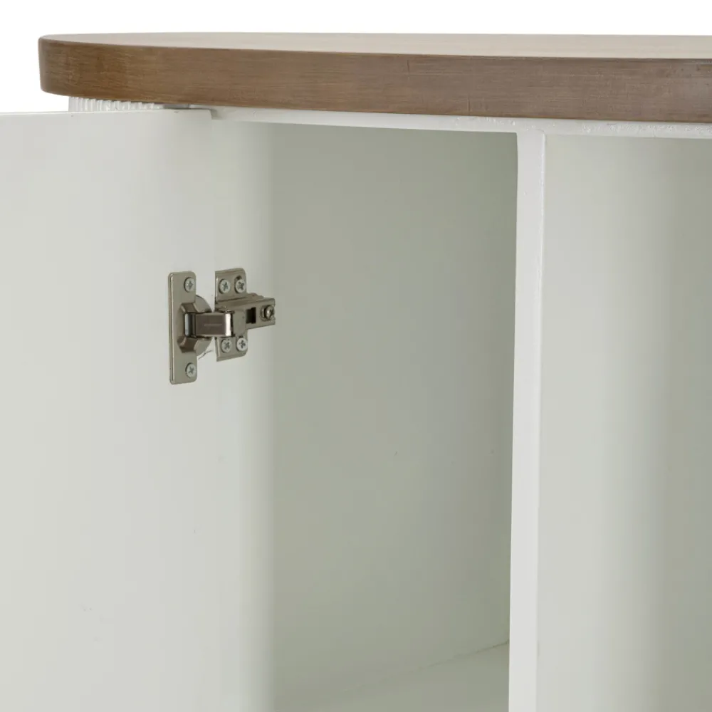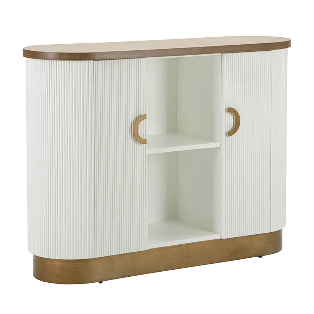 Dieses geschwungene Möbelstück verkörpert die perfekte Verbindung zwischen Funktionalität und anspruchsvollem Stil . Die weiche Silhouette und die abgerundeten Ecken des Schranks werden durch die warme Oberfläche hervorgehoben, die die weißen geriffelten Türen umrahmt. Der vertikale Rippeneffekt verleiht nicht nur Struktur und optische Tiefe, sondern erweckt auch ein Gefühl erneuerter klassischer Eleganz .