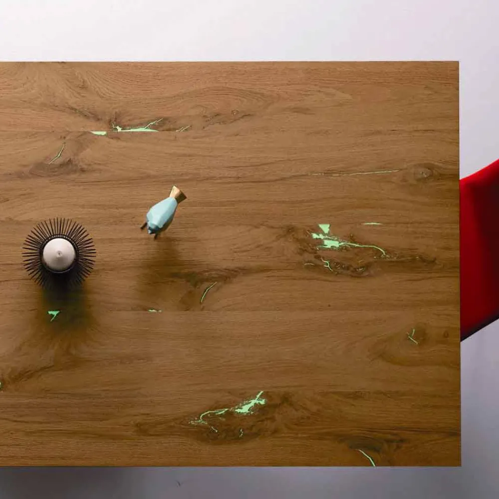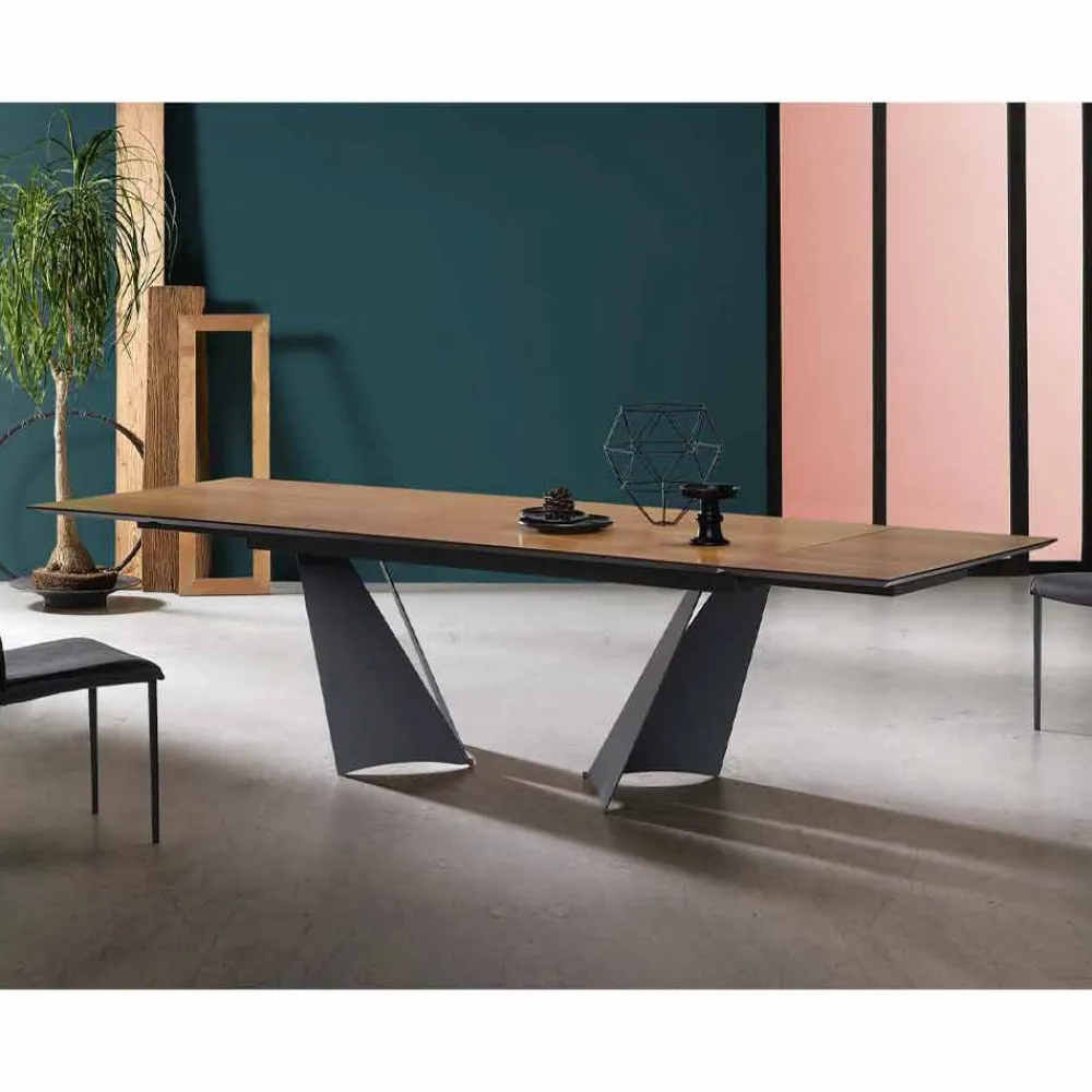 Dieser Esstisch Made in Italy zeichnet sich durch ein innovatives und elegantes Design aus, dank der Kombination von Materialien und Oberflächen, die ihn zu einem idealen Produkt für Umgebungen mit einem modernen und raffinierten Stil machen. Die Besonderheit des Tisches ist zweifellos die ungewöhnliche Struktur der beiden lackierten Metallbeine , die nicht vollständig auf dem Boden, sondern nur auf zwei Punkten ruhen und so den Charme des Produkts erhöhen. Aufgrund seiner Form wirkt die Basis leicht und schlank, aber in Wirklichkeit erweist sie sich als robust und stabil und trägt das Gewicht der Oberseite aus 2,5 cm dickem Furnierholz, das dank des Vorhandenseins von 2 abnehmbaren 47 cm langen Verlängerungen kann eine Länge von 294 cm erreichen und bietet Platz für bis zu 14 Personen zum Mittag- und Abendessen mit Freunden.