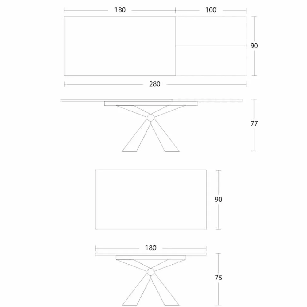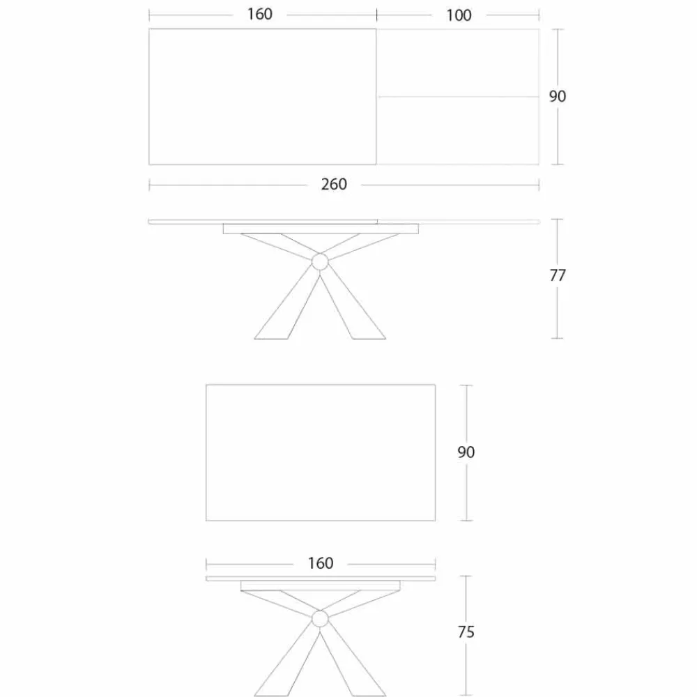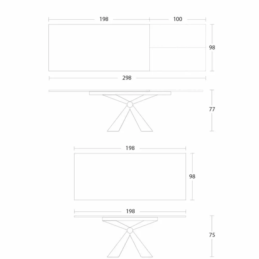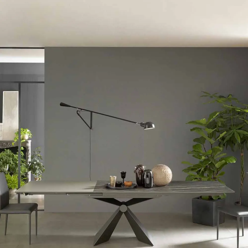 Dieser rechteckige ausziehbare Esstisch hat eine Platte aus MDF-Platte mit Laminam-Keramik auf der Oberfläche, die in verschiedenen Ausführungen erhältlich ist, und einen Sockel aus geprägtem graphitfarbenem Metall mit 4 Beinen, die in der Mitte in einem Metallstützknoten zusammenlaufen, der zu den Besonderheiten des Designs wird von der Ergänzung, sowie die Gewährleistung einer hohen Stabilität.
