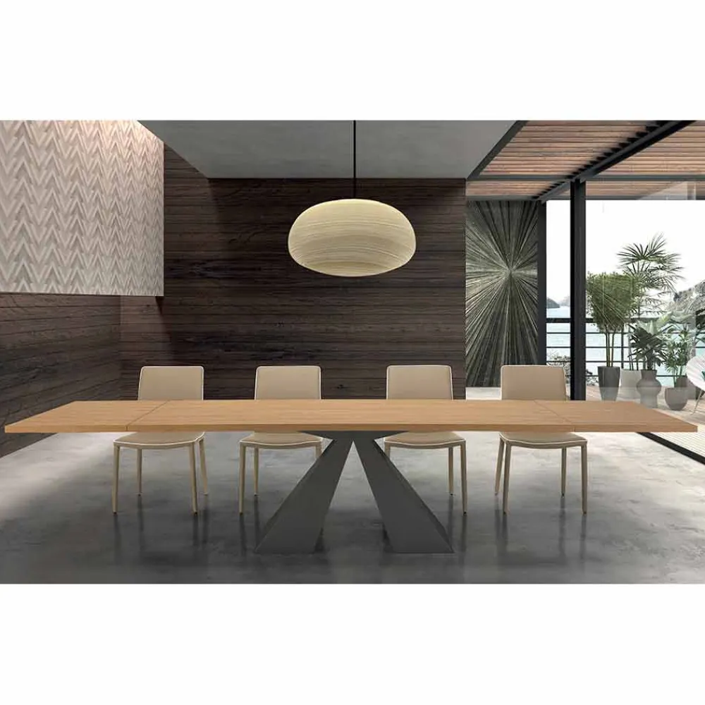 In Italien hergestellter Esstisch mit HPL-Laminatplatte und nerzlackiertem Stahlgestell . Ein Möbelstück mit einem imposanten und massiven Stil , das seinen Platz in Esszimmern oder modernen Küchen erobert, wo es dank seiner starken zeitgenössischen Persönlichkeit alle Blicke auf sich zieht. Seine Besonderheit ist die ausziehbare Platte , die eine Länge von 300 cm erreichen kann (2 externe Verlängerungen), was ihn zur perfekten Idee für alle macht, die gerne Mittag- und Abendessen mit Freunden organisieren und eine ebenso funktionale wie moderne Lösung suchen, die einen wunderbaren Ort schaffen kann Harmonie mit den umgebenden Möbeln. Darüber hinaus ermöglicht uns die HPL-Platte, ein Hochdrucklaminat , das äußerst beständig gegen Chemikalien, Abrieb und Kratzer ist, eine solide und robuste Oberfläche anzubieten, die ihre ästhetischen Eigenschaften unverändert beibehält und so ein optimales, lang anhaltendes Ergebnis erzielt.