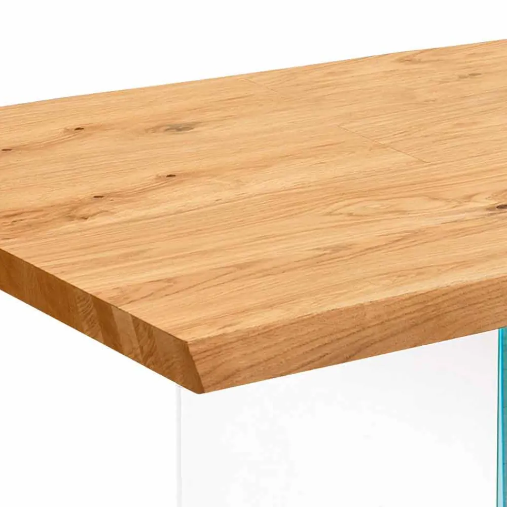 Der Nico- Tisch zeichnet sich durch ein Design aus, das mit dem Kontrast verschiedener Materialien wie Holz und Glas spielt. Die Basis besteht aus 12 mm dickem, extraklarem gehärtetem Glas, während die Platte aus rohem Eichenfurnier mit massiven und entrindeten Kanten besteht.