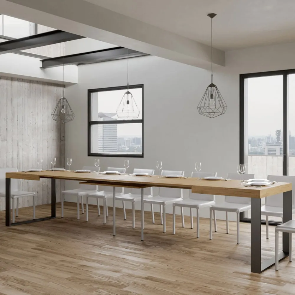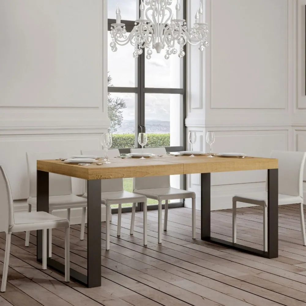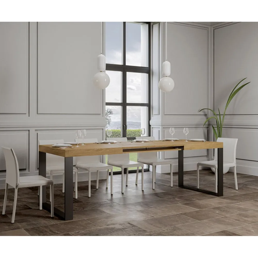 Ausziehbarer Esstisch, Platte aus furniertem Holz, 8 cm dick, und Gestell aus anthrazit lackiertem Eisen,vollständig Made in Italy..