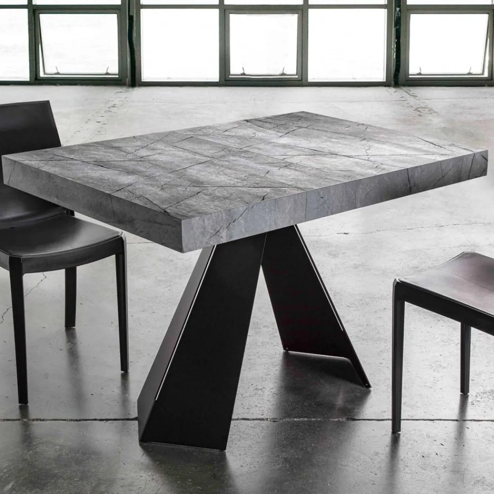 Sein Design wird durch den besonderen schwarzen Sockel einzigartig und avantgardistisch, der dank seiner ungewöhnlichen Linien seine Ästhetik bereichert und seinen starken Charakter verstärkt und ihn zu einem perfekten Esstisch macht, der die Einrichtung stilvoller Umgebungen vervollständigen kann. modern und raffiniert. Die verschiedenen Oberflächen, die für die Platte verfügbar sind, ermöglichen es auch, ihre Funktionalität noch weiter zu steigern, da sie verschiedene Lösungen bieten, die unterschiedliche Geschmäcker und unterschiedliche Bedürfnisse befriedigen können.