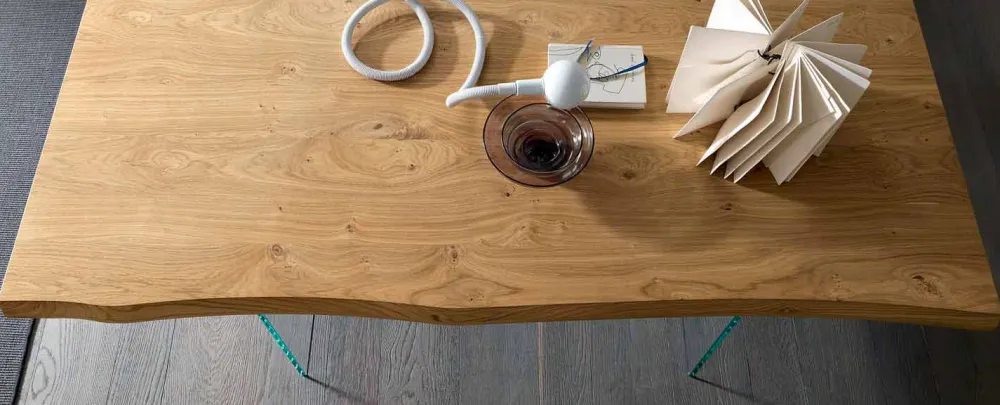 Seine Besonderheit besteht in den transparenten Glasbeinen , die die Holzplatte mit einem starken natürlichen Bezug und einer hohen Dicke (5 cm) scheinbar schweben lassen.