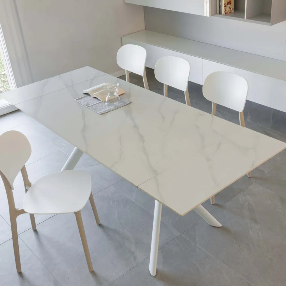 Ausziehbarer Esstisch mit Platte aus Feinsteinzeug und Untergestell aus Metall.