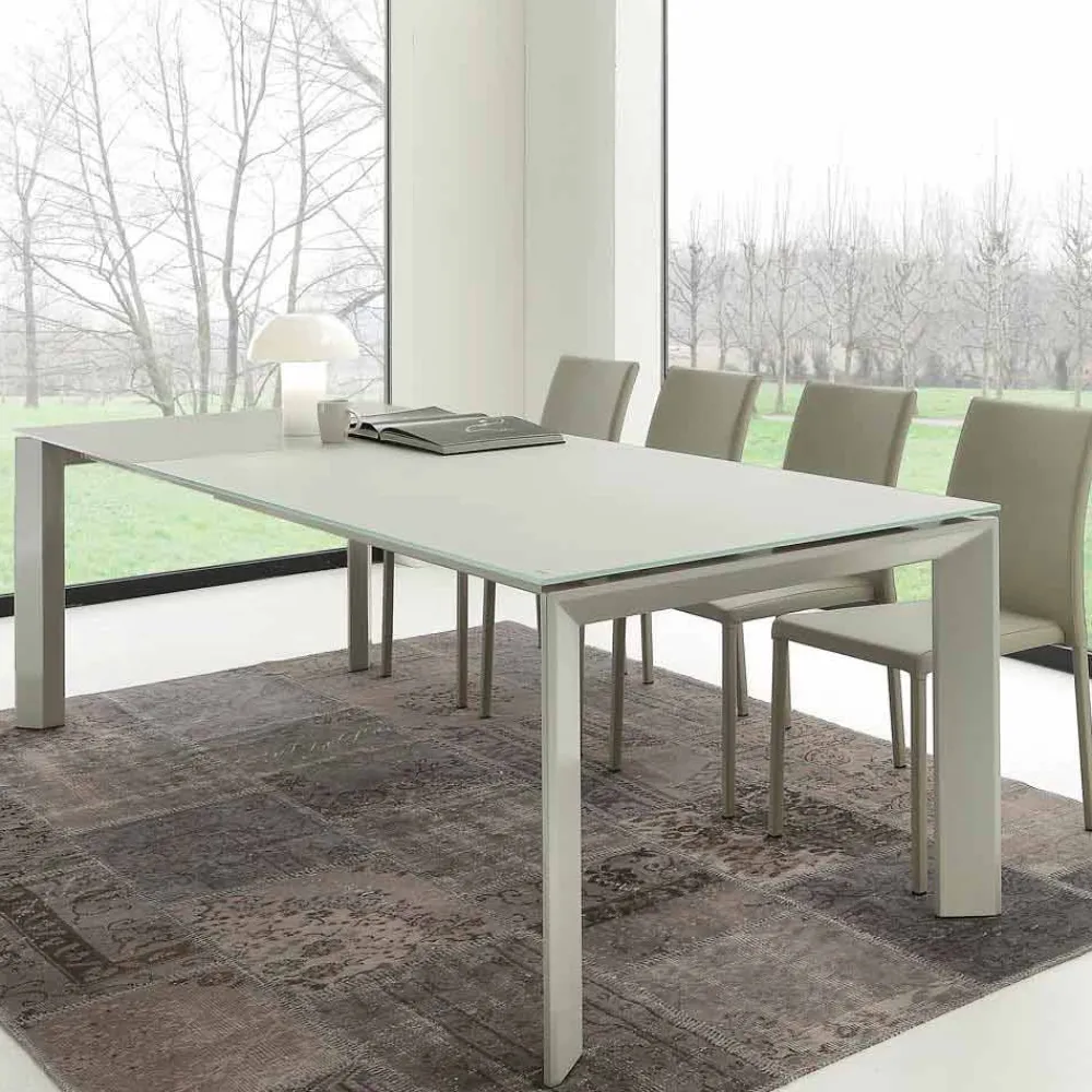 Der Tischgestell besteht aus Metall und mit vertieften doppelseitigen Beinen.