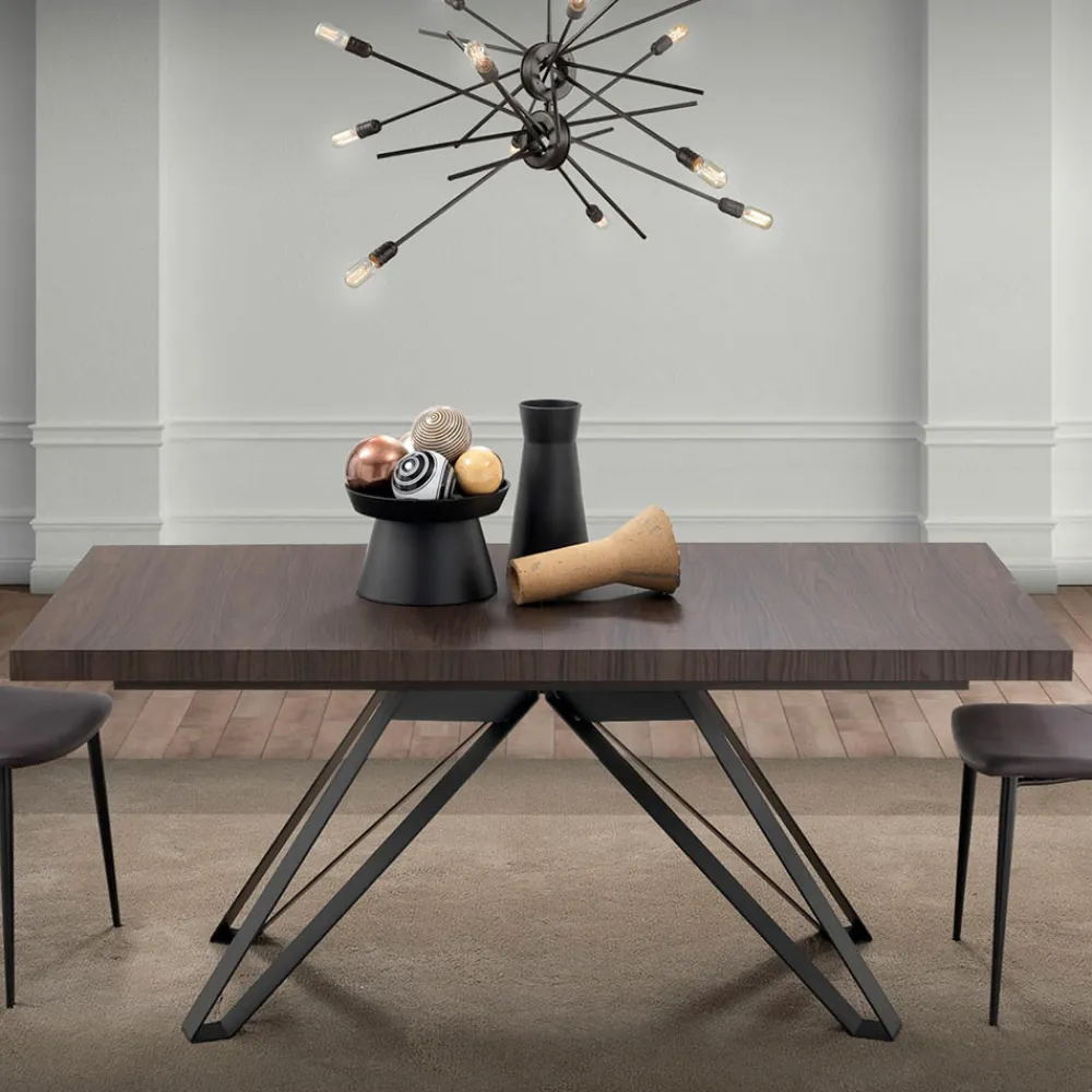 Ausziehbarer Wohnzimmertisch mit Platte und Verlängerungen aus klappbarem Melamin (Stärke 55 mm), Finish in Avantgarde-Nussbaum mit Registerporen und Untergestell aus mattschwarz lackiertem Metall, komplett in Italien hergestellt.