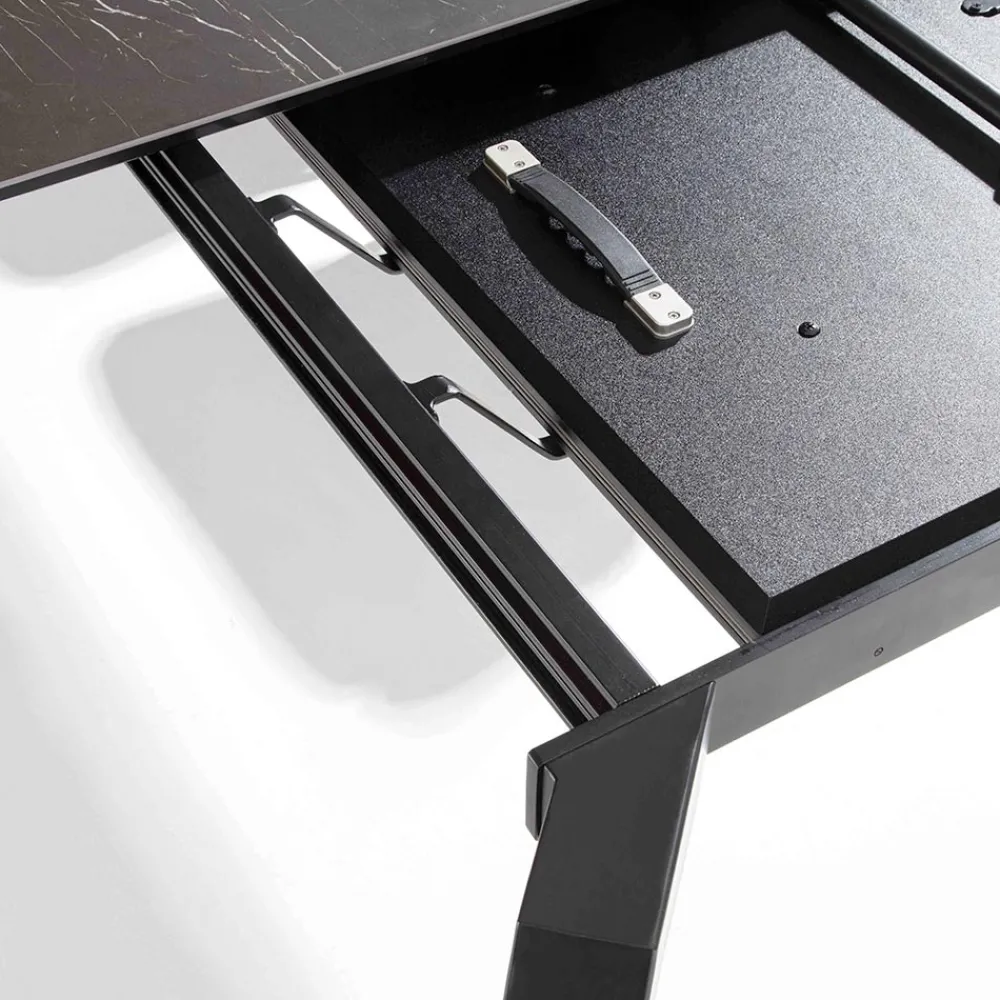 Der schwarz lackierte Metallrahmen sorgt für Festigkeit und Stabilität und behält gleichzeitig ein schlankes und modernes Profil bei. Das integrierte Öffnungssystem ist diskret und intuitiv und ermöglicht es Ihnen, den Tisch in Sekundenschnelle zu erweitern, um ganz einfach mehr Gäste unterzubringen.