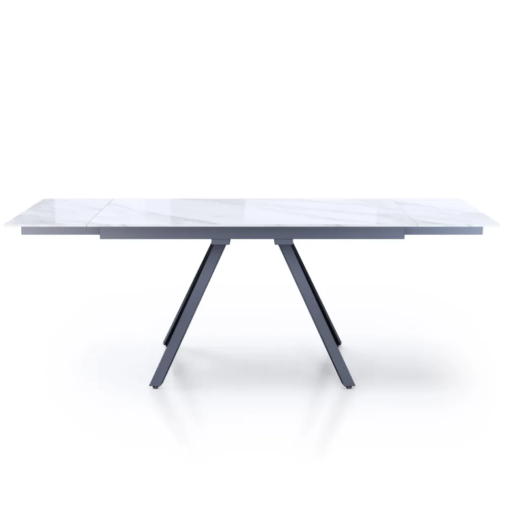 Tisch für den Innenbereich mit Platte aus 10 mm starker Keramik mit glänzend weißem Marmorfinish , Untergestell aus mattgrau lackiertem Stahl und vollständig unter der Tischplatte positionierten Verlängerungen .