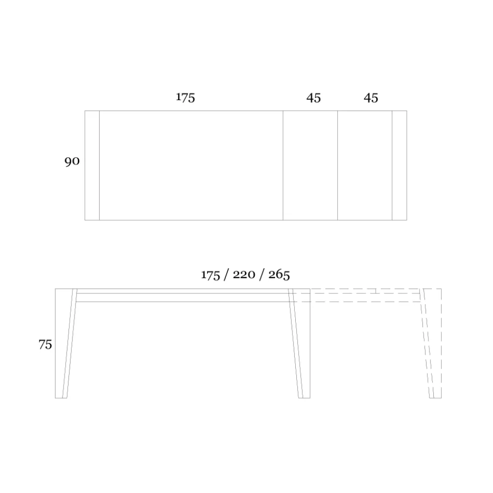 - Länge: 175/220/265 cm x Tiefe: 90 cm x Höhe: 75 cm – 2 Verlängerungen