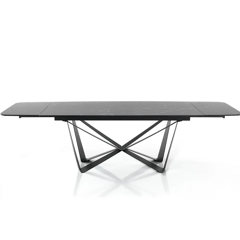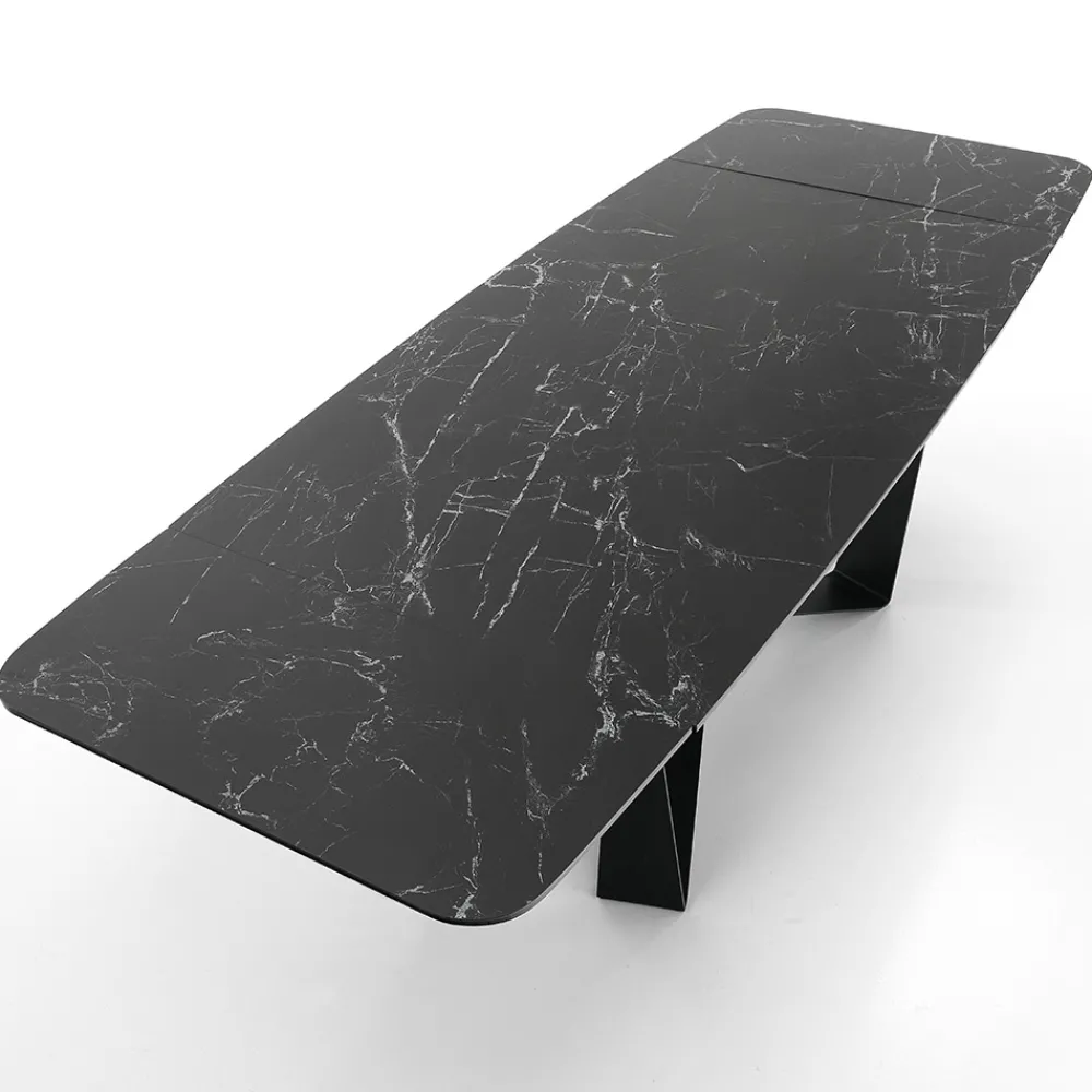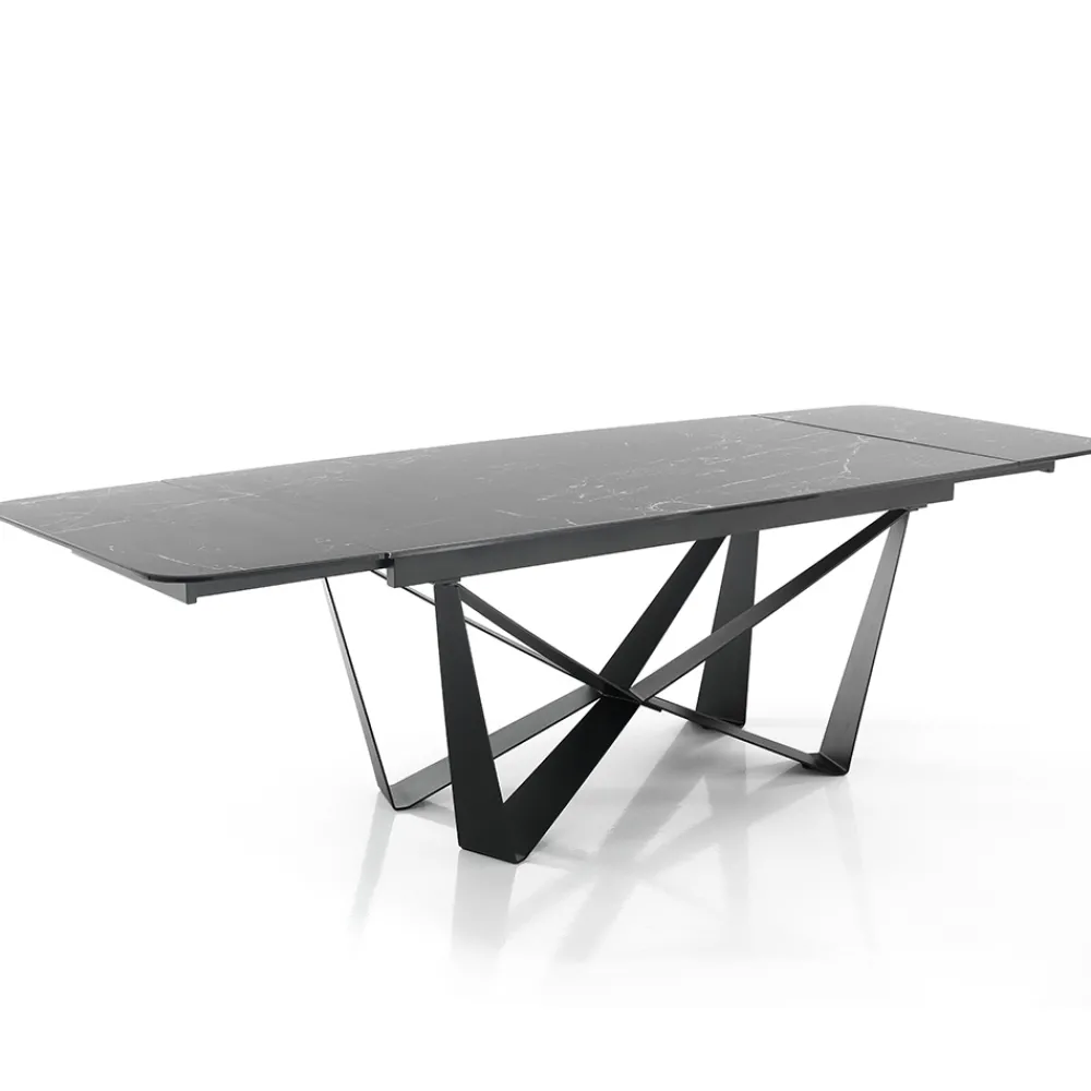 Esstisch mit lackierter Stahlstruktur und Keramikplatte mit mattem Marmorfinish (12 mm stark). Dank der 2 Verlängerungen von jeweils 40 cm , die unter der Tischplatte positioniert sind, erreicht der Tisch eine maximale Länge von 240 cm und bietet so Platz für eine größere Anzahl von Gästen für herrliche Mittag- und Abendessen mit Freunden. Die perfekte Kombination aus der Eleganz der Keramik und den imposanten Details des Stahlsockels schafft ein Möbelstück mit einzigartiger Persönlichkeit und starker visueller Wirkung, ideal um den Blickfang in Esszimmern oder modernen Küchen zu erobern.
