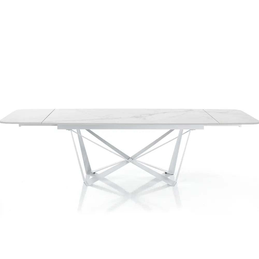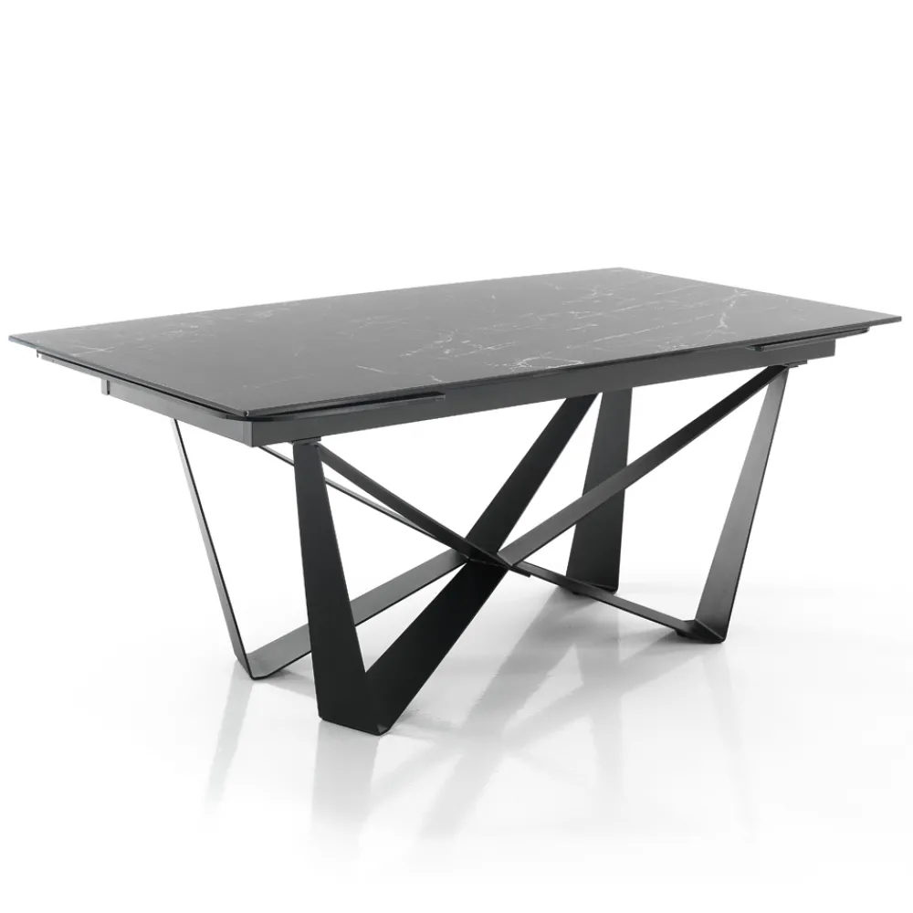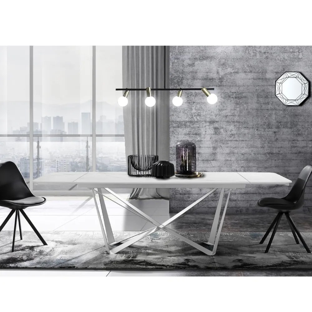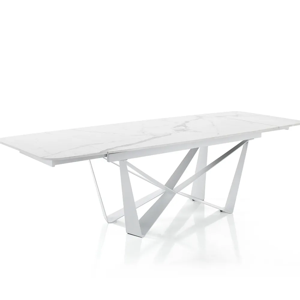 Esstisch mit lackierter Stahlstruktur und Keramikplatte mit mattem Marmorfinish (12 mm stark). Dank der 2 Verlängerungen von jeweils 40 cm , die unter der Tischplatte positioniert sind, erreicht der Tisch eine maximale Länge von 240 cm und bietet so Platz für eine größere Anzahl von Gästen für herrliche Mittag- und Abendessen mit Freunden. Die perfekte Kombination aus der Eleganz der Keramik und den imposanten Details des Stahlsockels schafft ein Möbelstück mit einzigartiger Persönlichkeit und starker visueller Wirkung, ideal um den Blickfang in Esszimmern oder modernen Küchen zu erobern.