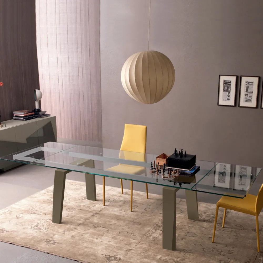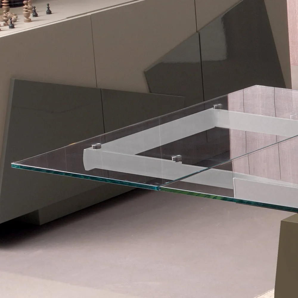 Ausziehbarer Esstisch aus transparentem Glas und Beine aus lackiertem Holz, 2 Größen made in Italy.