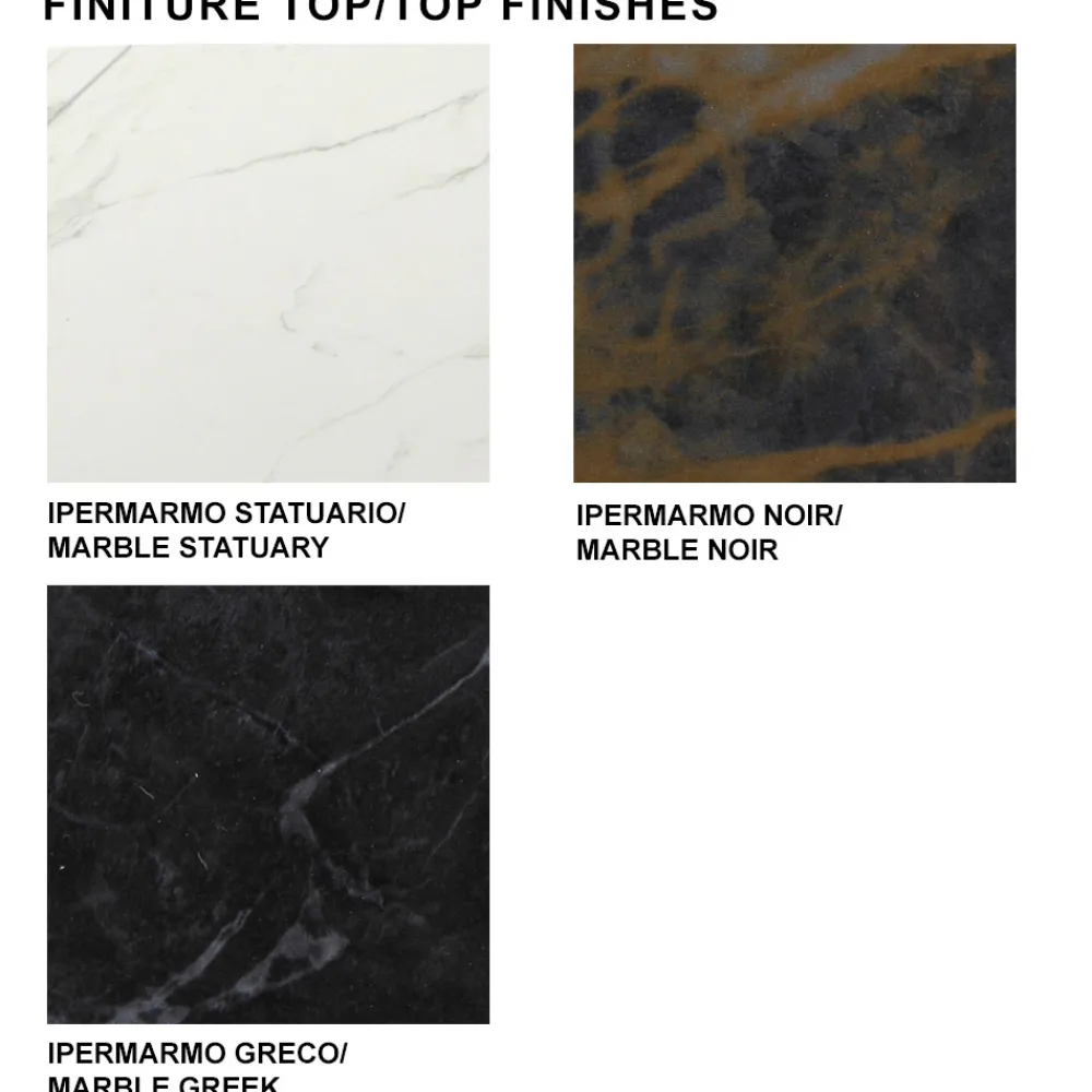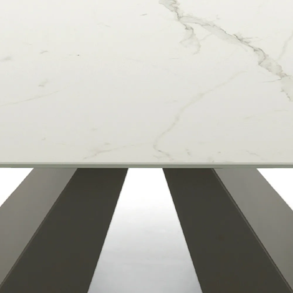 Gekennzeichnet durch eine Keramikplatte aus einer abgeschrägten Glasplatte und einer Keramikplatte mit Marmoreffekt sowie einem Sockel aus nerzlackiertem Stahl.