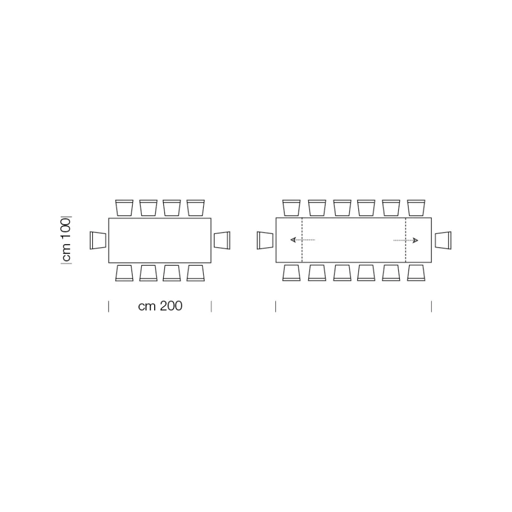 - L 200 (300) x T 100 x H 78 cm. 14 Sitzplätze mit zwei 39 cm langen Innenverlängerungen.