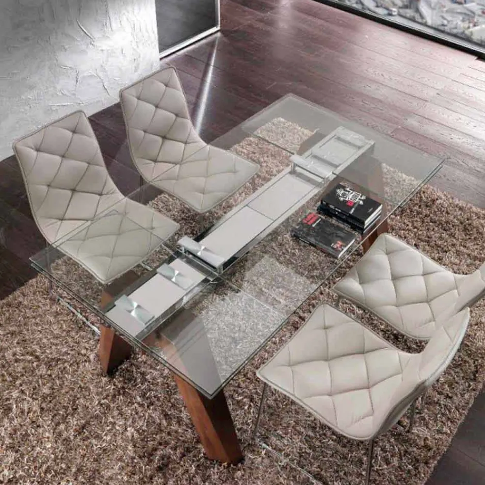 Der verlängerbare Tisch Chad von mit einer Hartglastischplatte und nußfarbenen Massivholzbeinen.