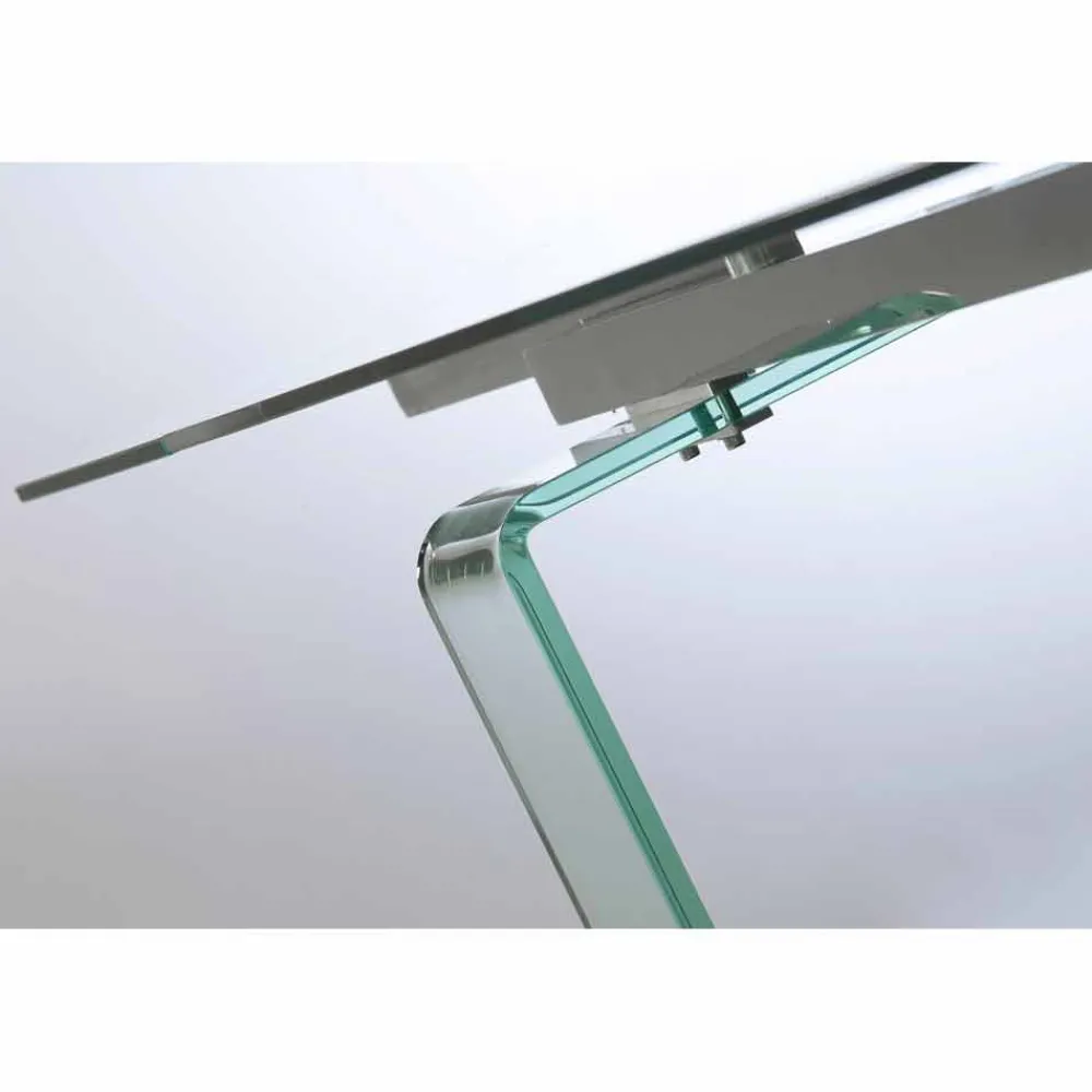 Der Tisch hat eine Tischplatte aus durchsichtigem Hartglas 12 mm und Beine mit 19 mm.