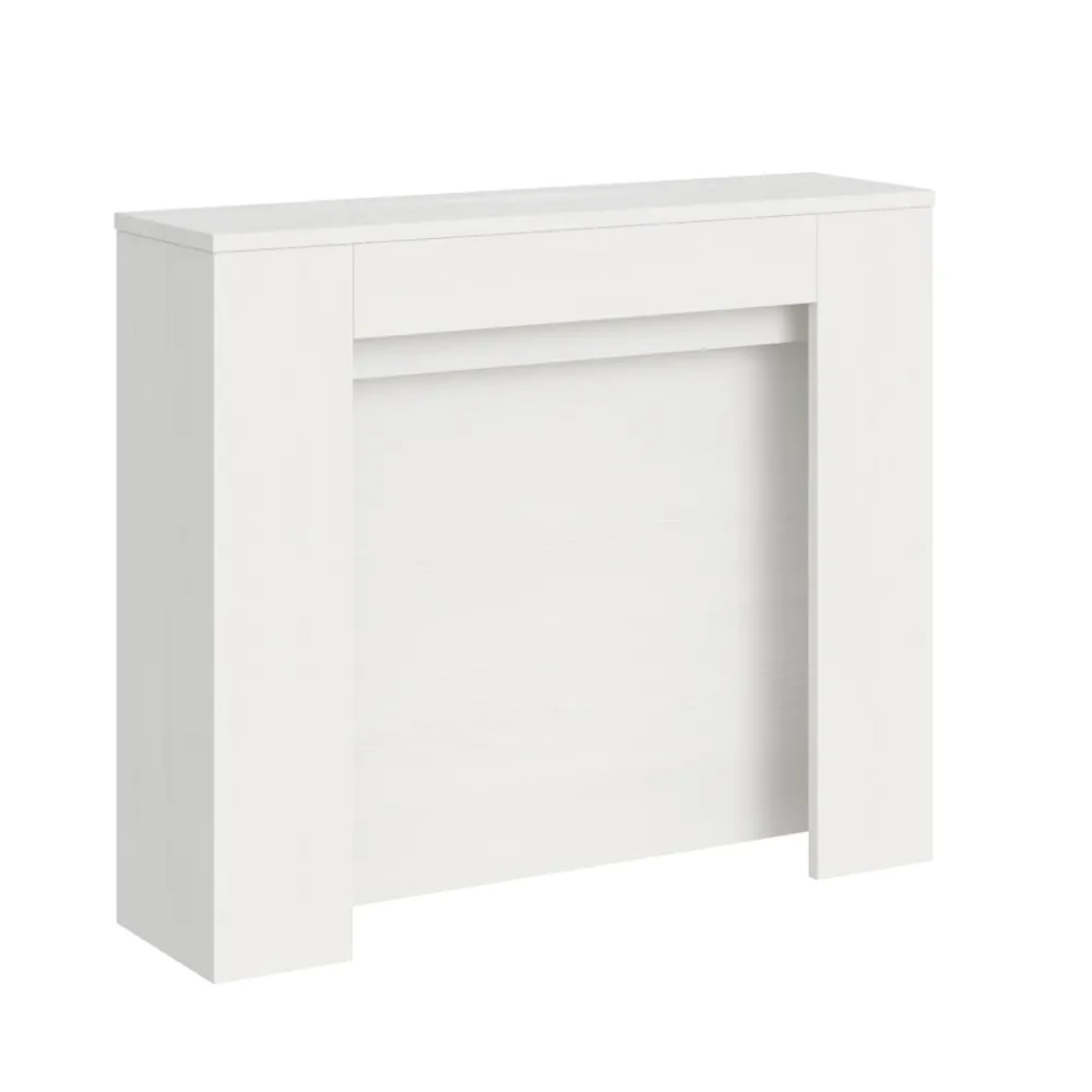 Dieser ausziehbare Konsolentisch è ist der Inbegriff von funktionellem und minimalistischem Design. Seine schlanke Form und die klaren Linien machen ihn zu einem vielseitigen Möbelstück, ideal für jeden Raum vom Eingangsbereich bis zum Wohnzimmer, das ein Bild von Raum und Ordnung bietet. Der Konsolentisch lässt sich mühelos erweitern und verwandelt sich von einem diskreten Möbelstück in einen praktischen Esstisch, der sich perfekt eignet, um Freunde und Familie zu besonderen Anlässen zu bewirten. Diese Vielseitigkeit macht ihn zur idealen Wahl für alle, die in kleinen Räumen leben, aber nicht auf Funktionalität und Stil verzichten wollen.