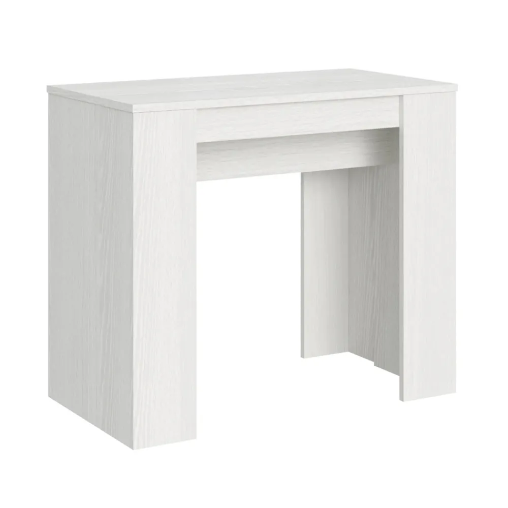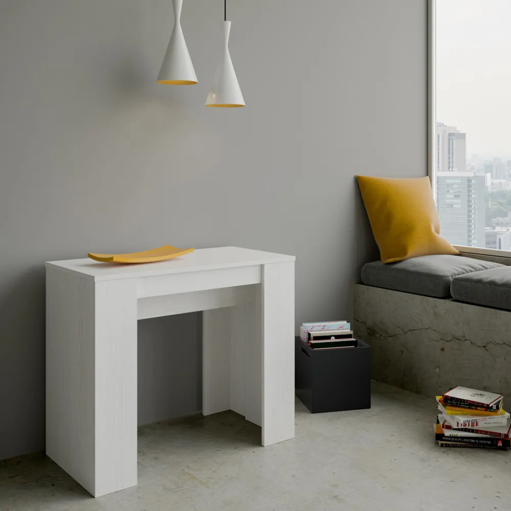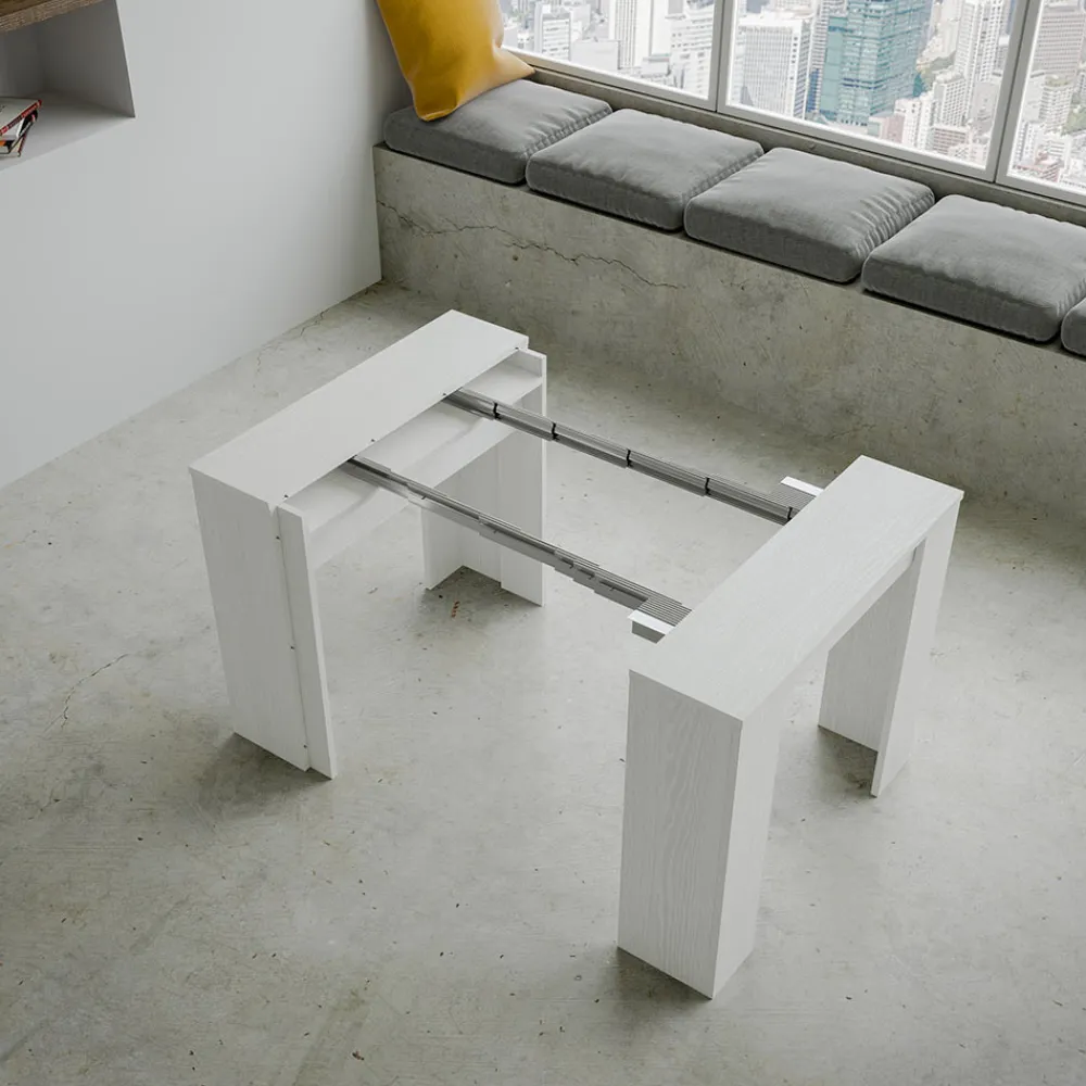 Dieser ausziehbare Konsolentisch è ein Meisterwerk aus zeitgenössischem Design und intuitiver Funktionalität. Die möblierte Holzplatte und die Seiten bieten ein helles und offenes Gefühl, ideal für diejenigen, die einen Raum schaffen wollen, der sowohl luftig als auch modern ist. Seine essentielle und klare Ästhetik macht ihn für jede Umgebung geeignet, perfekt um sich in ein minimalistisches Design einzufügen oder als Kontrast in einem farbigen und lebendigen Design.