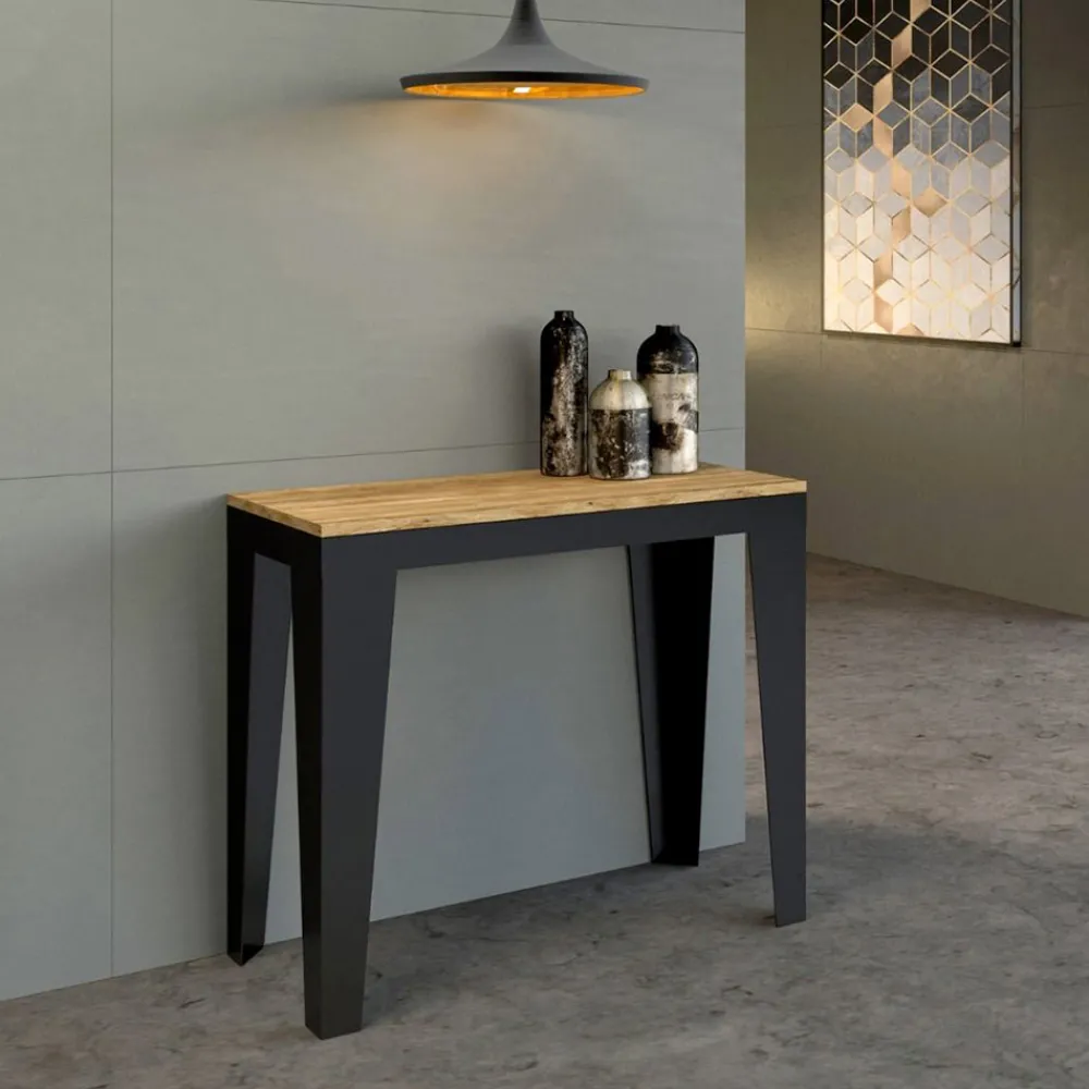 Dieser ausziehbare Konsolentisch ist die Quintessenz von Einfallsreichtum und elegantem Design. Sein durchdachter Look entsteht durch die Kombination von scharfen Linien und kontrastierenden Farben, mit schlanken Beinen aus anthrazitfarbenem Metall, die eine Holzplatte tragen und ein auffallendes optisches Gleichgewicht schaffen.