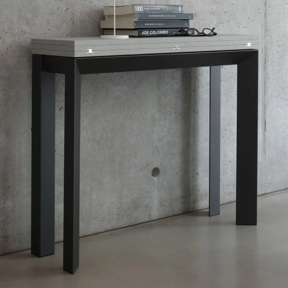 Ausziehbare Konsole mit klappbarer Oberseite aus Granit-Melamin und Sockel aus geprägtem Metall in Graphitoptik , vollständig hergestellt in Italien.