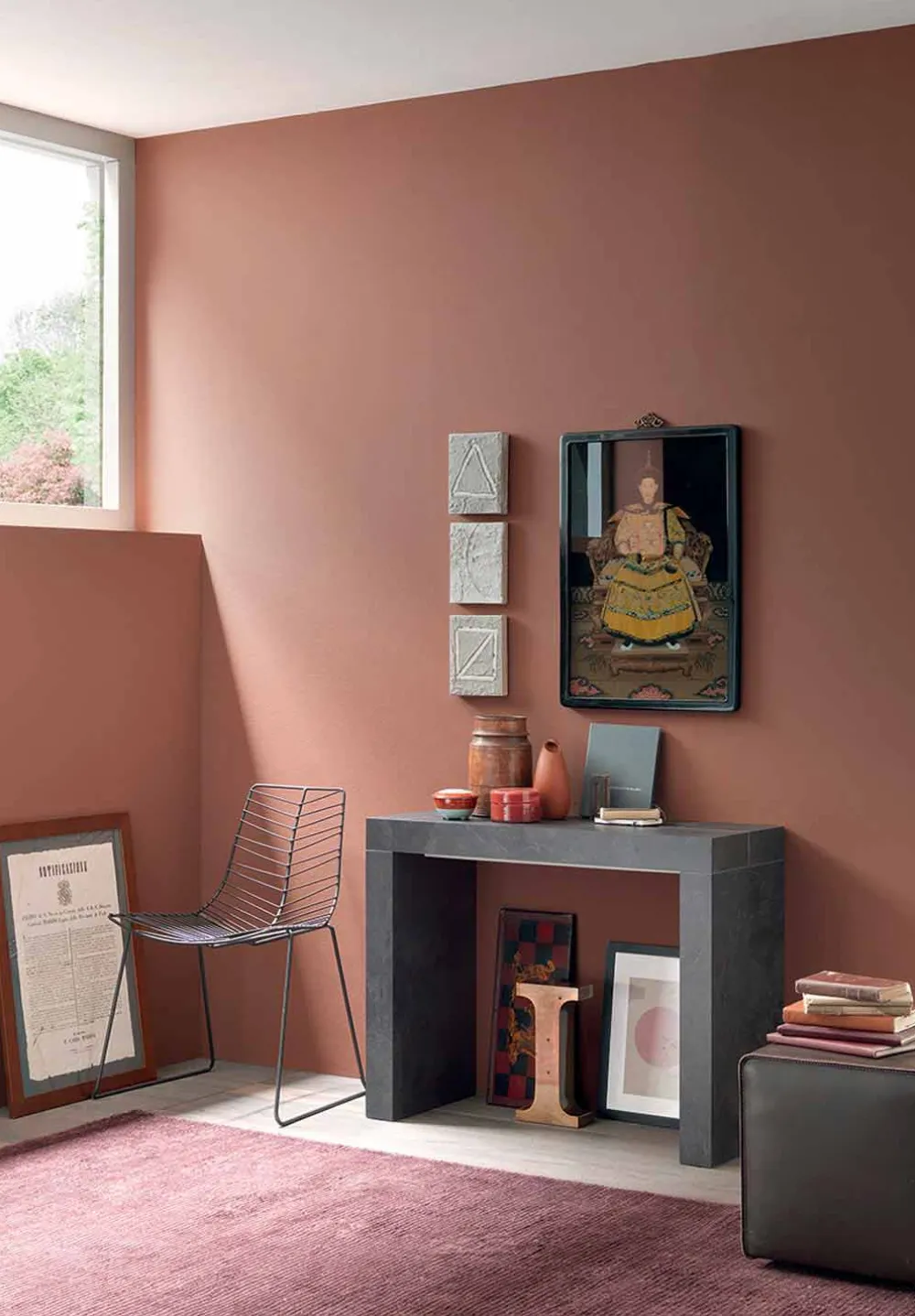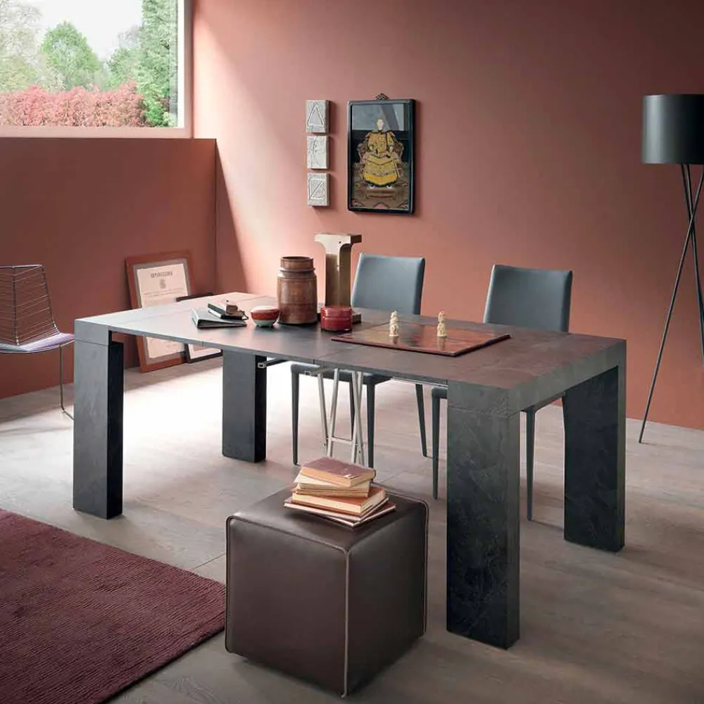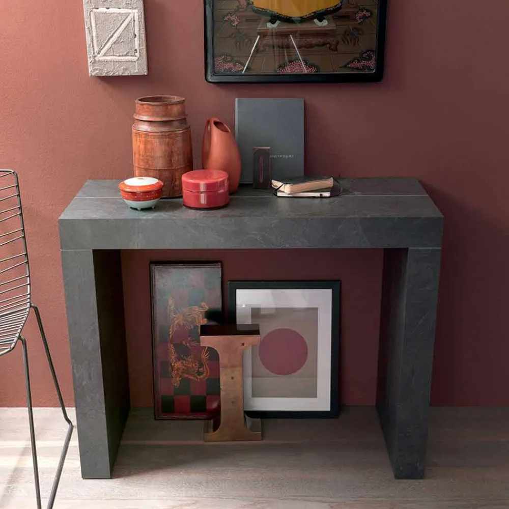 Diese ausziehbare Konsole zeichnet sich durch ein wichtiges und monumentales Design aus, das auf szenische und funktionale Weise zum Protagonisten des Raums wird.