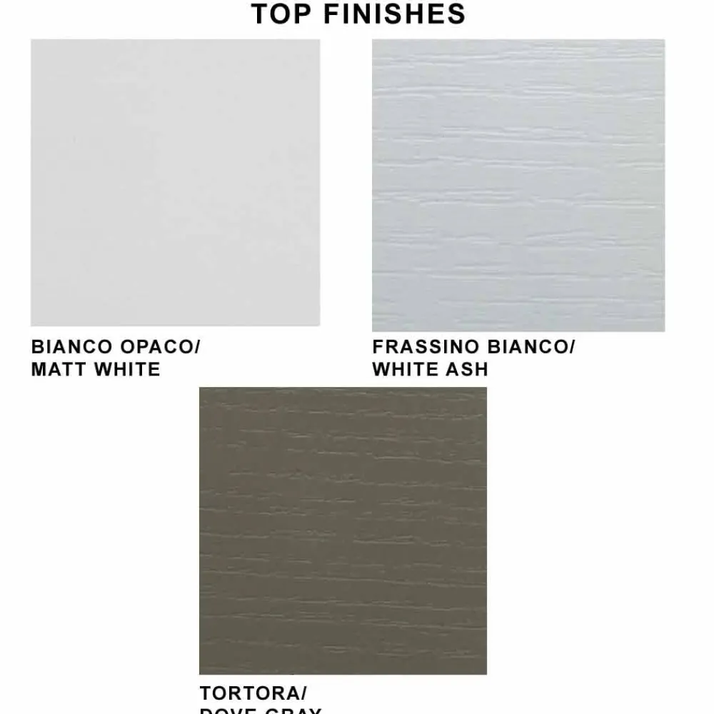 Gekennzeichnet durch eine Melaminholzplatte (Stärke 20 mm) und einem Sockel aus weiß oder graphitlackiertem Stahl.