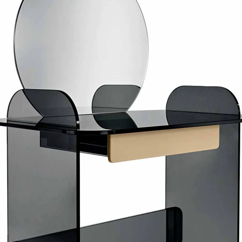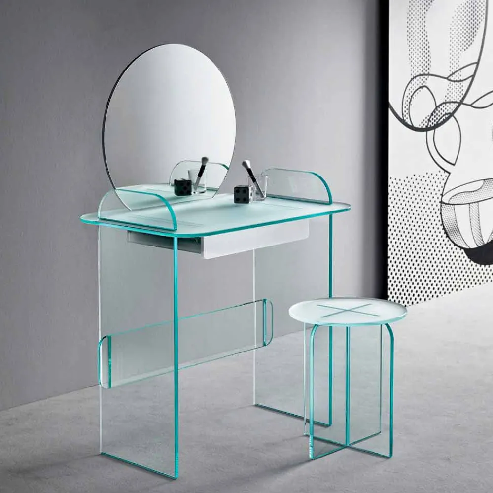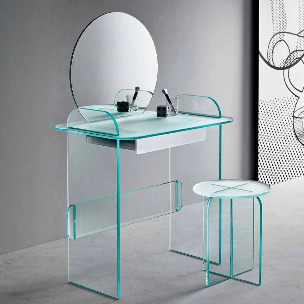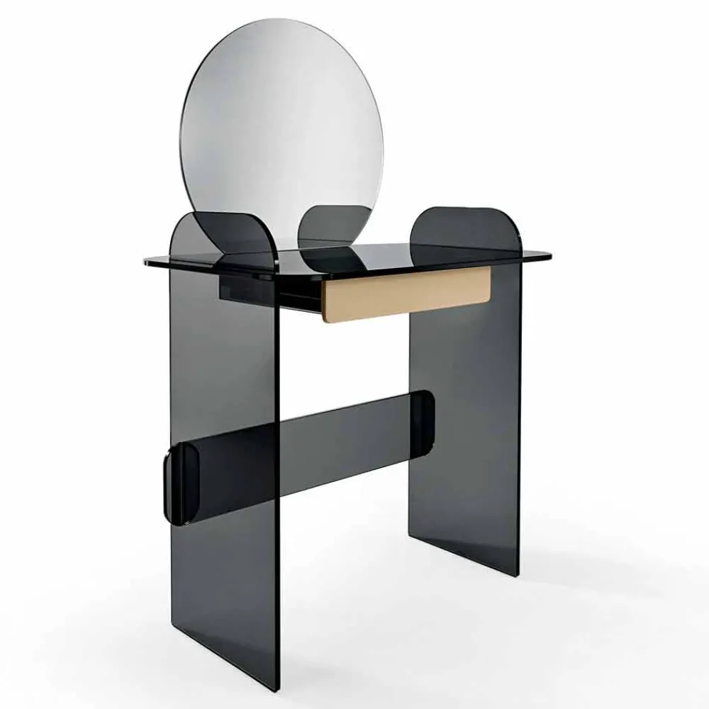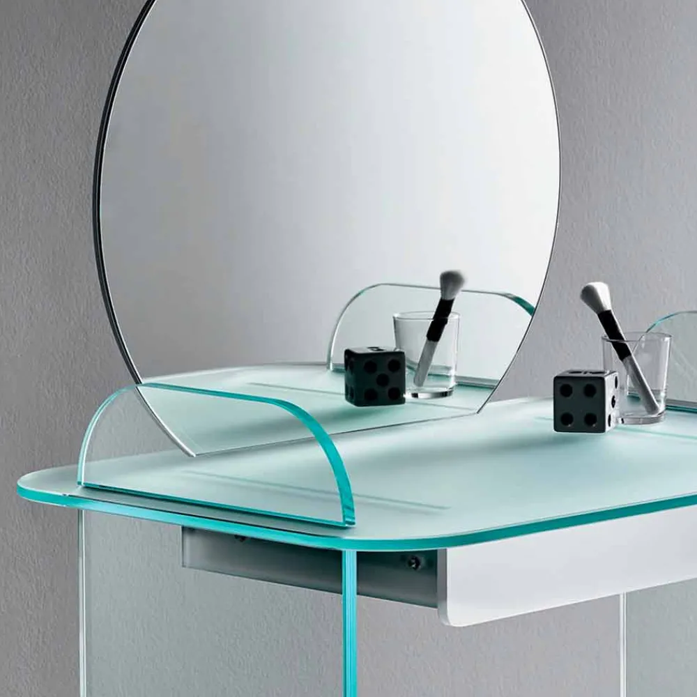 Schminktisch mit Spiegel und Schublade aus extra klarem, geräuchertem oder grünem Glas made in Italy.