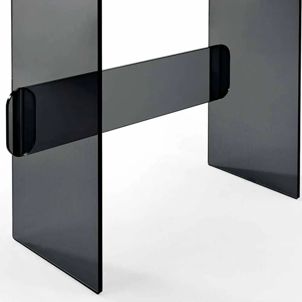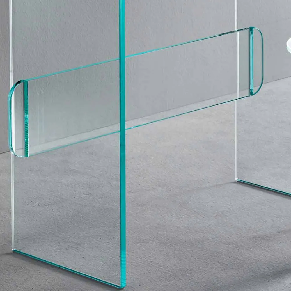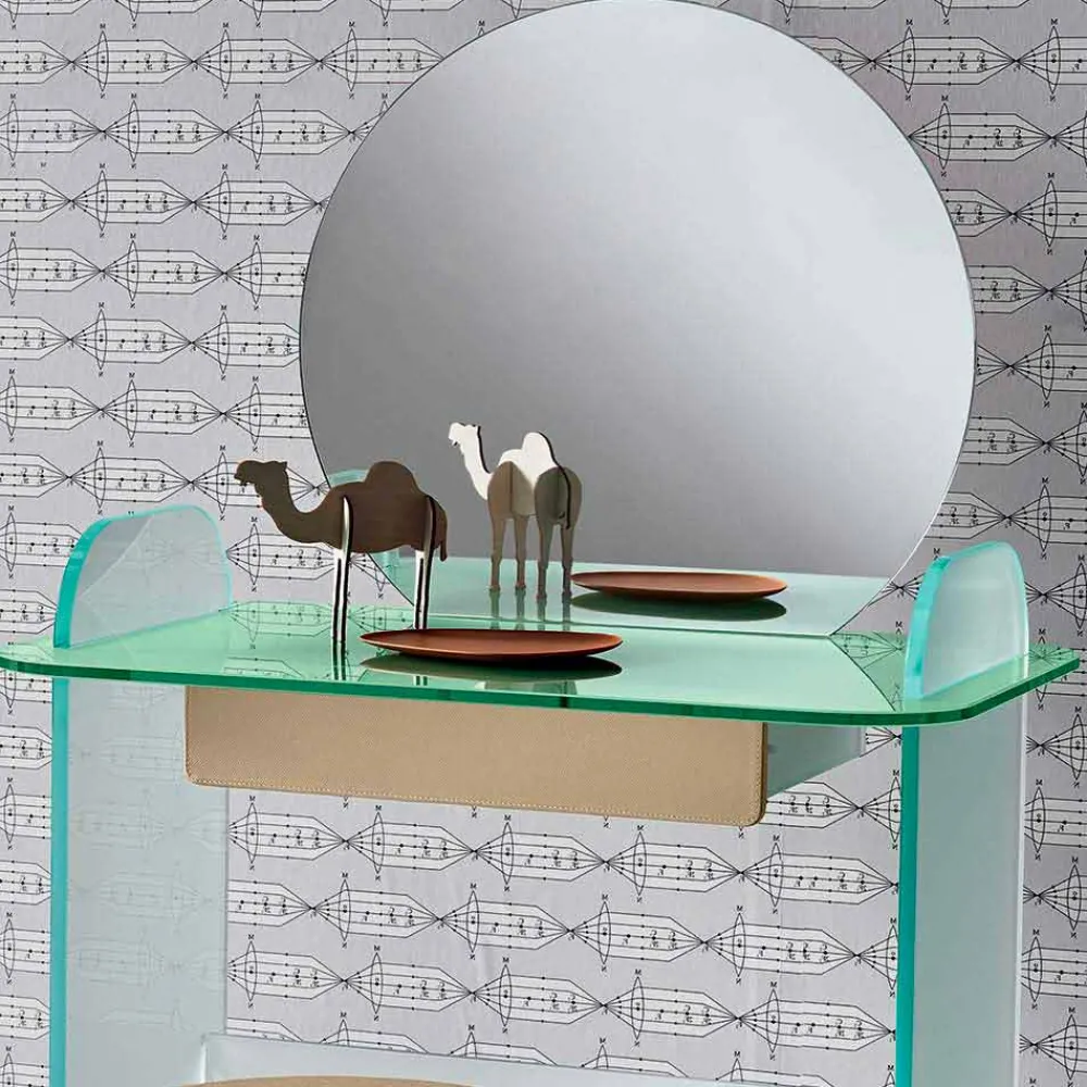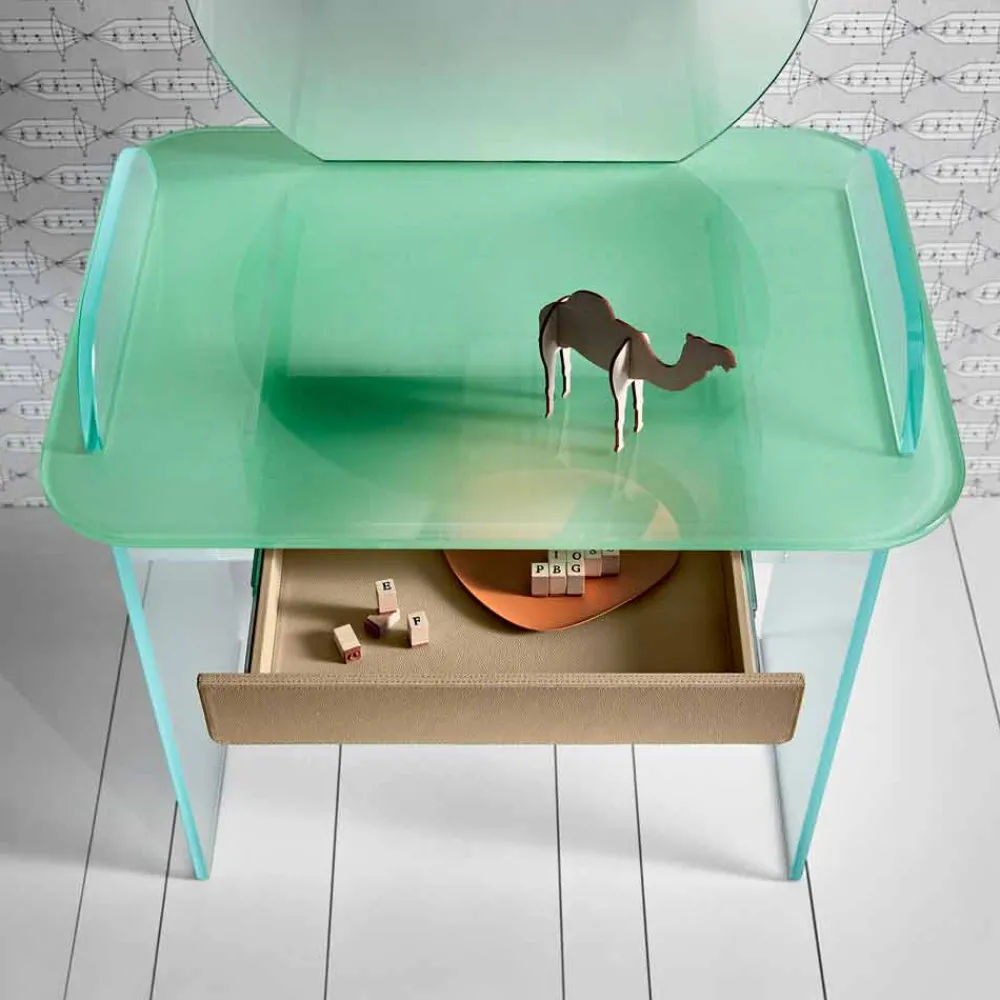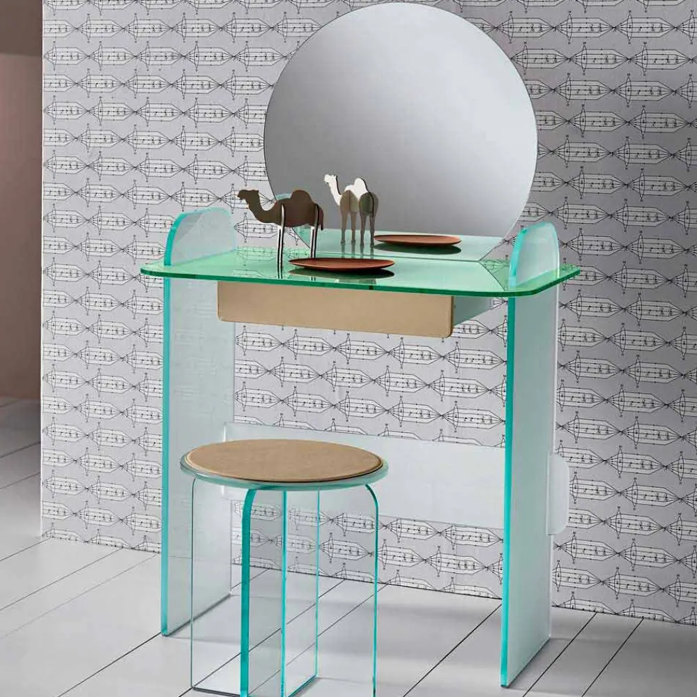Schminktisch mit Spiegel und Schublade aus extra klarem, geräuchertem oder grünem Glas made in Italy.