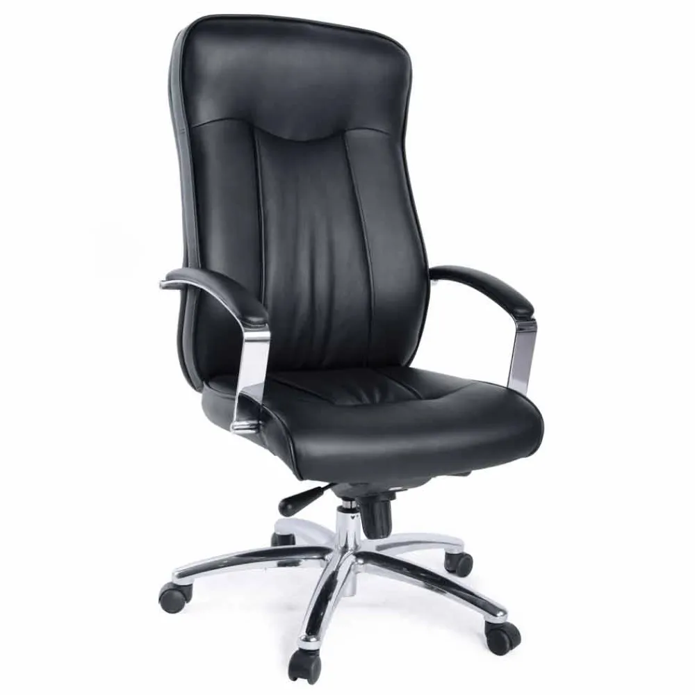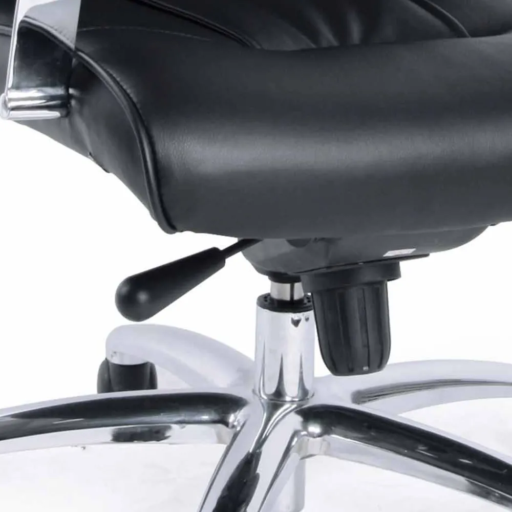Drehbarer und direktionaler Bürosessel mit verchromtem Metallgestell und Ledersitzen.